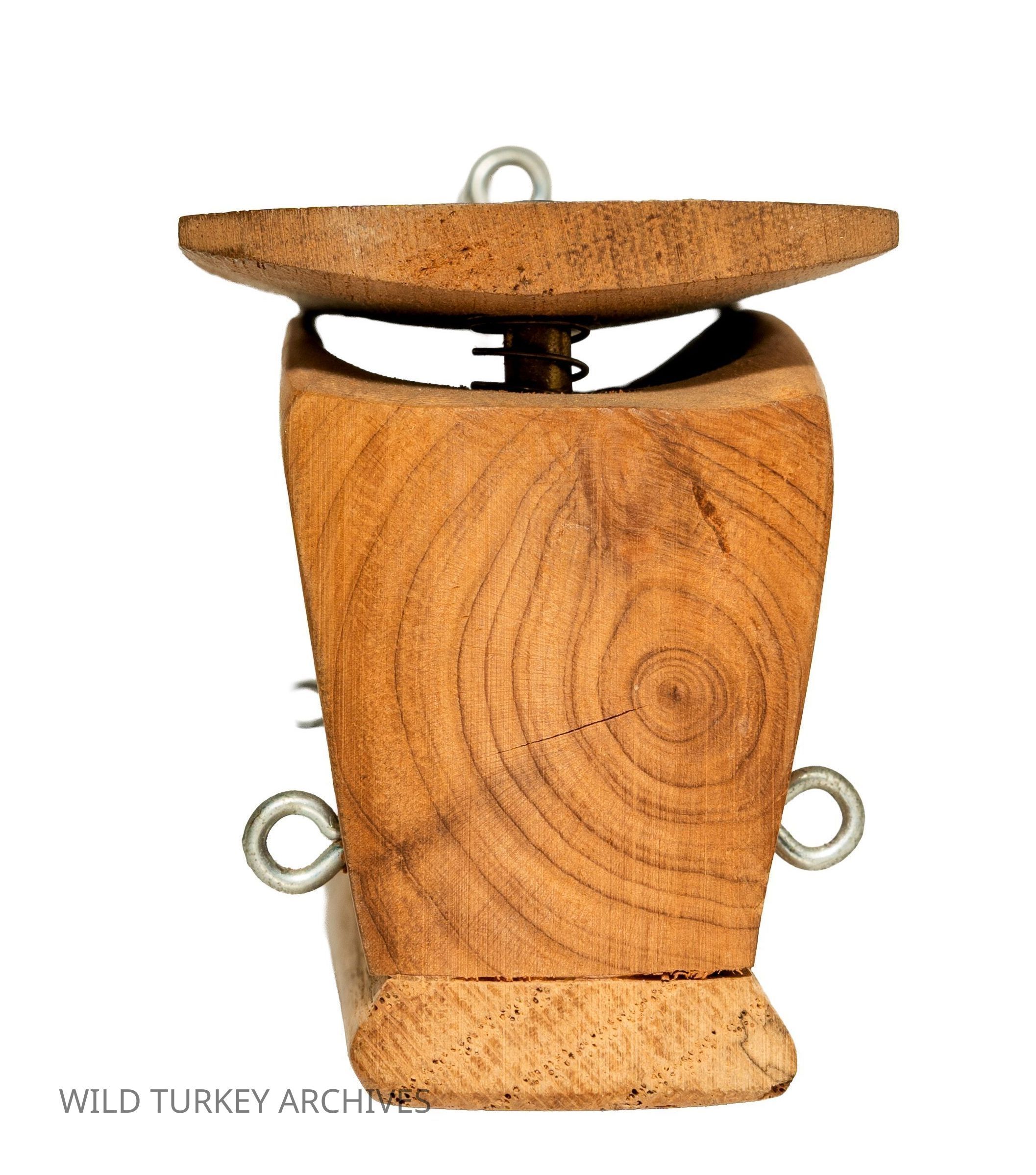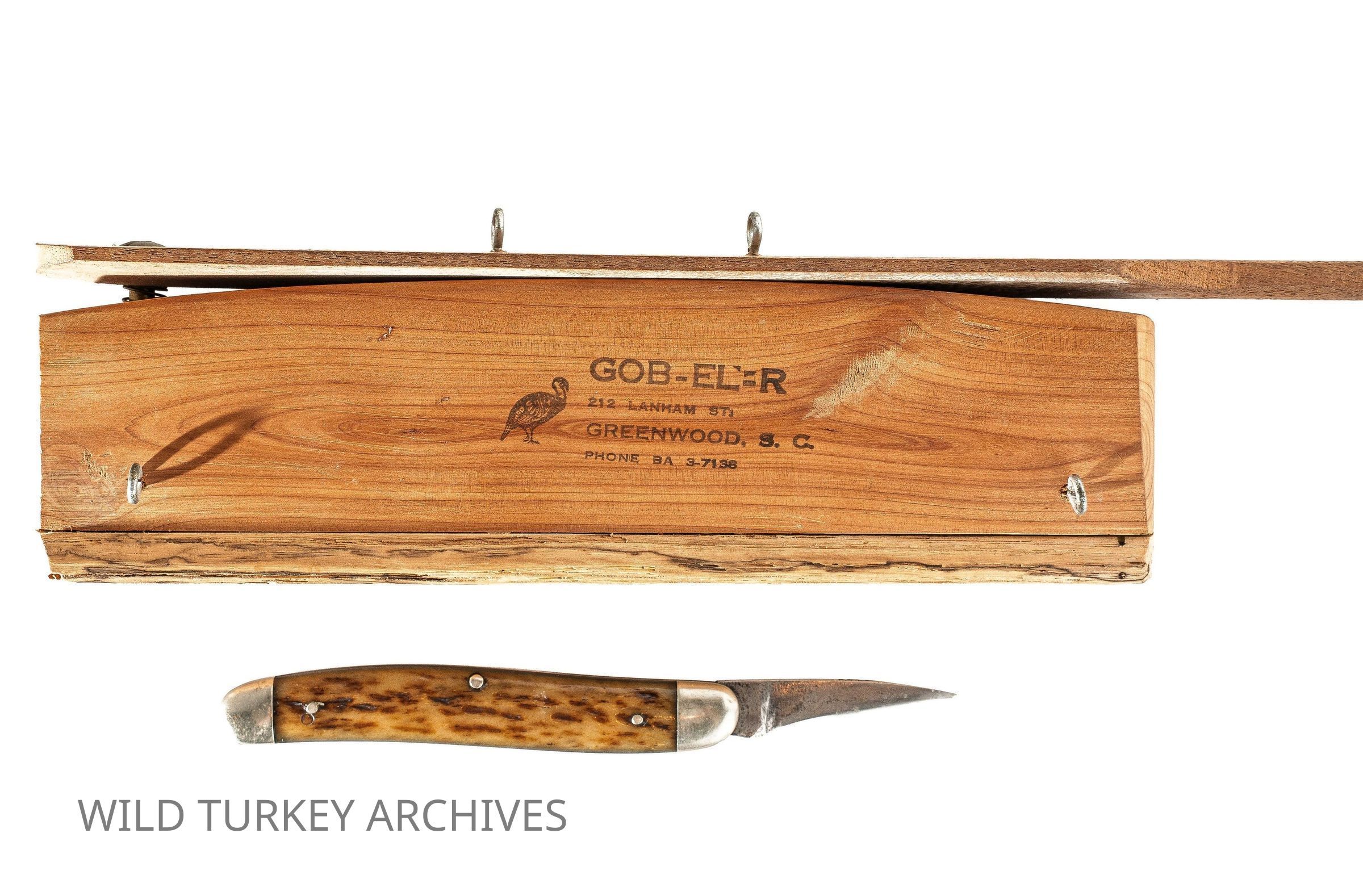 Neil Douglas “Gobbler” Cost (1923-2002) pf Greenwood, SC is one of the best-known box call makers. His rise as a callmaker coincided with that of the restoration of the wild turkey and the National Wild Turkey Federation. His early calls were stamped GOB-EL-R, and some of those early calls had a base made from the limb of a cedar tree.Collection