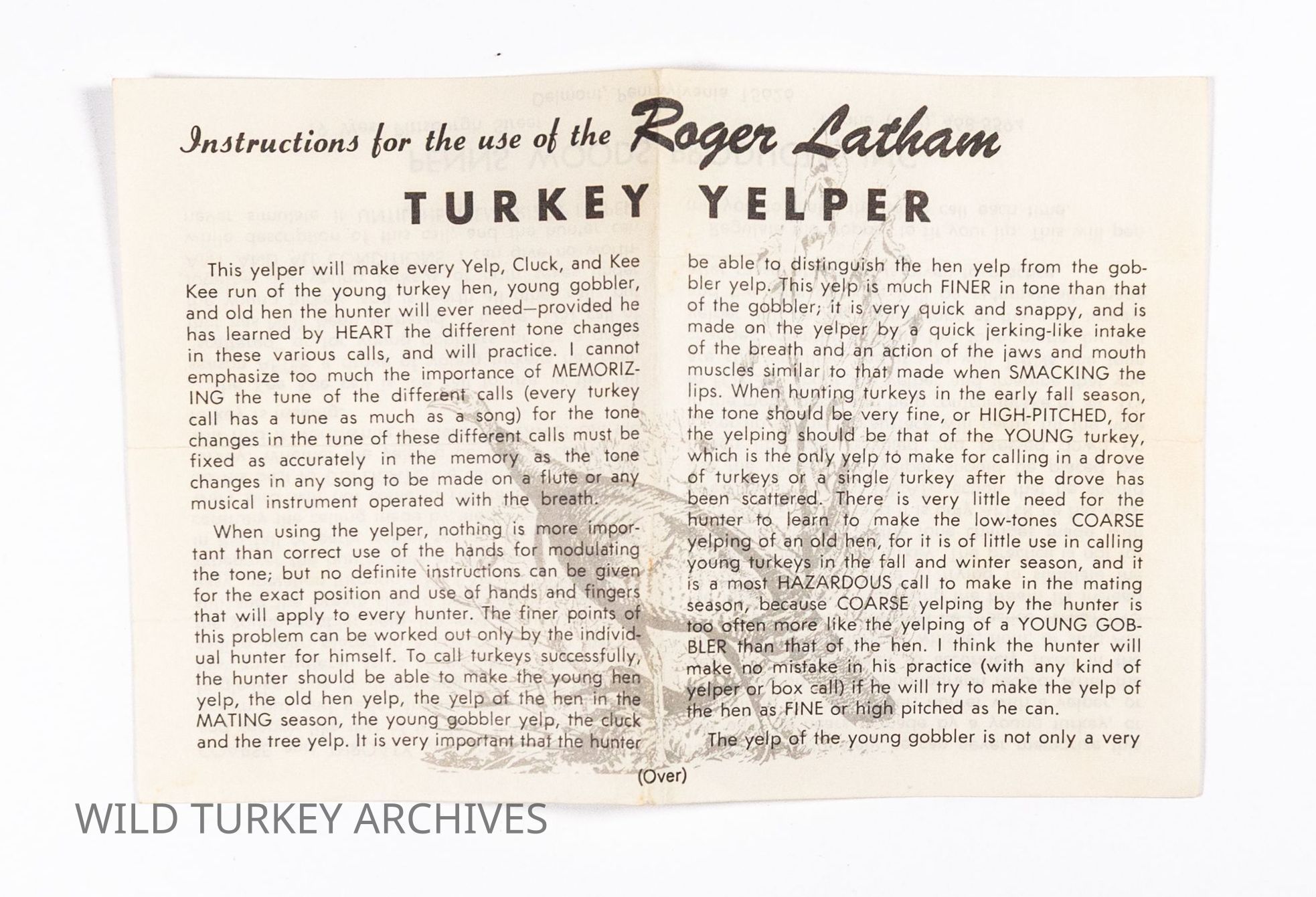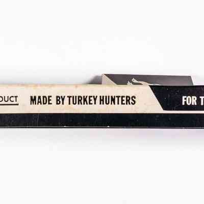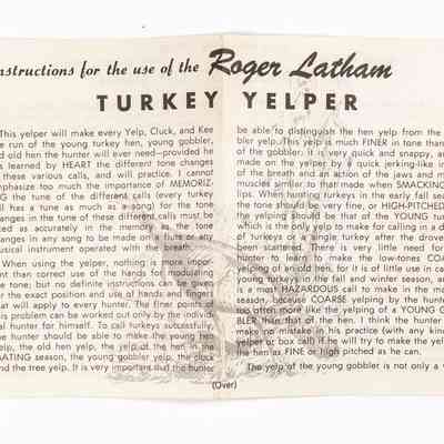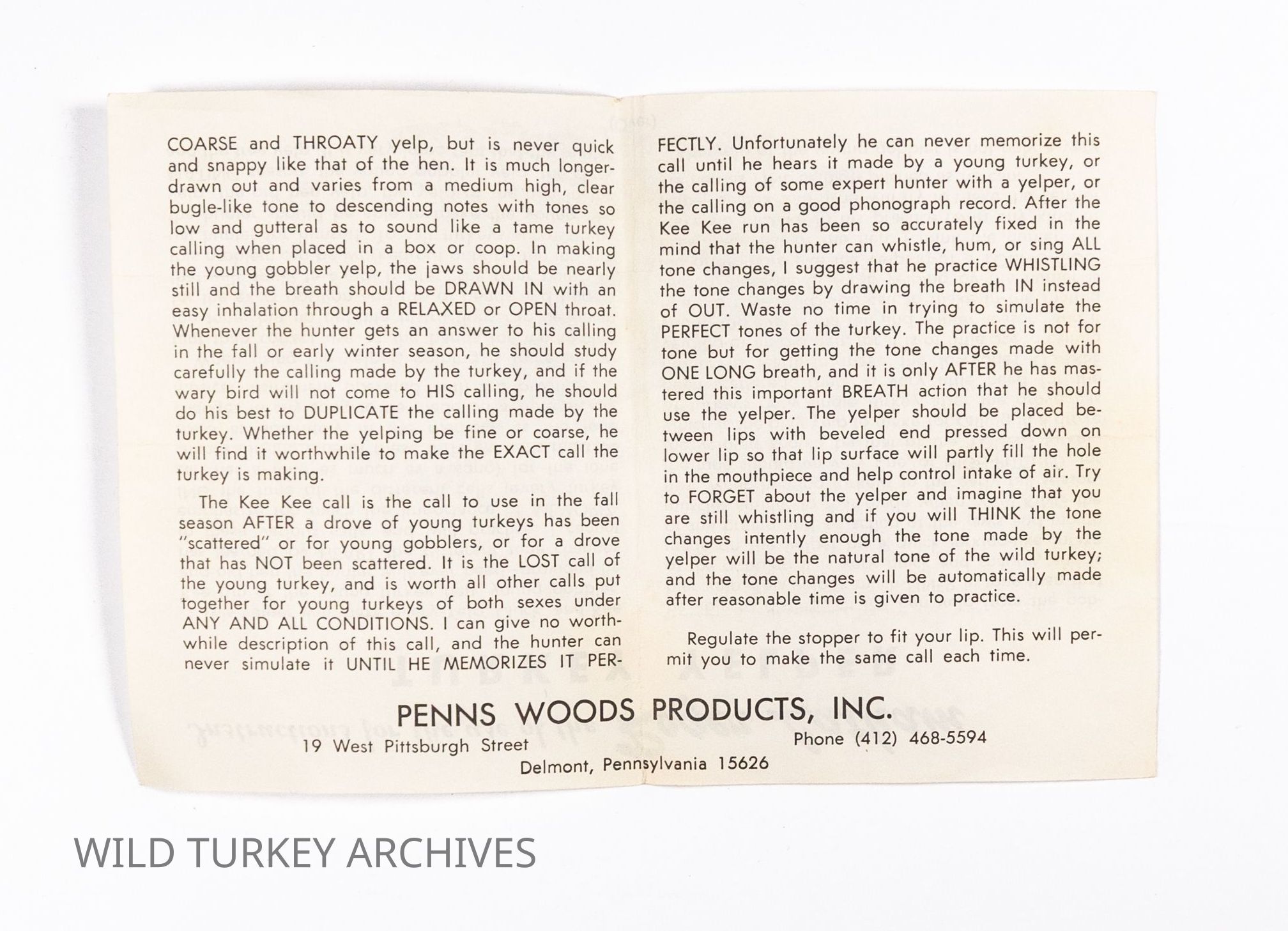 Frank R. Piper established Penn's Woods Products, Inc. after buying Roger Latham's turkey call business in 1965. Latham had started his business by acquiring the turkey call portion of legendary Tom Turpin's callmaking business in 1957. The "Turpin-style" trumpet yelper thus had a chain of custody through that ownership, which Penn's Woods heavily leveraged in naming its calls and advertising its products. Penn's Woods followed Latham's example by making its trumpets from walnut, a domestically available wood. Penn's Woods calls did not have a finish applied and the interior of the calls were somewhat rough (unsanded). Whereas Turpin and Latham mostly used brass ferrules, the Penn's Woods trumpets utilized aluminum. Delrin mouthpieces with a rubber lipstop (or "stopper") rounded out the calls. This particular variant did not yet have a model number assigned, but had a bronze sticker labeled "Turkey Call, Tom Turpin Yelper" and had the company address. While the company would ultimately name its primary line of trumpets the "Tom Turpin" yelper, its earliest instructions used Roger Latham's name. Note the price of $5/95/ea for the call. There is at least one version of the instructions that predates this, with the street address listed as 124 Stotler Drive instead of 19 West Pittsburgh Street on this sheet.Collection