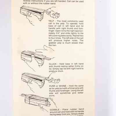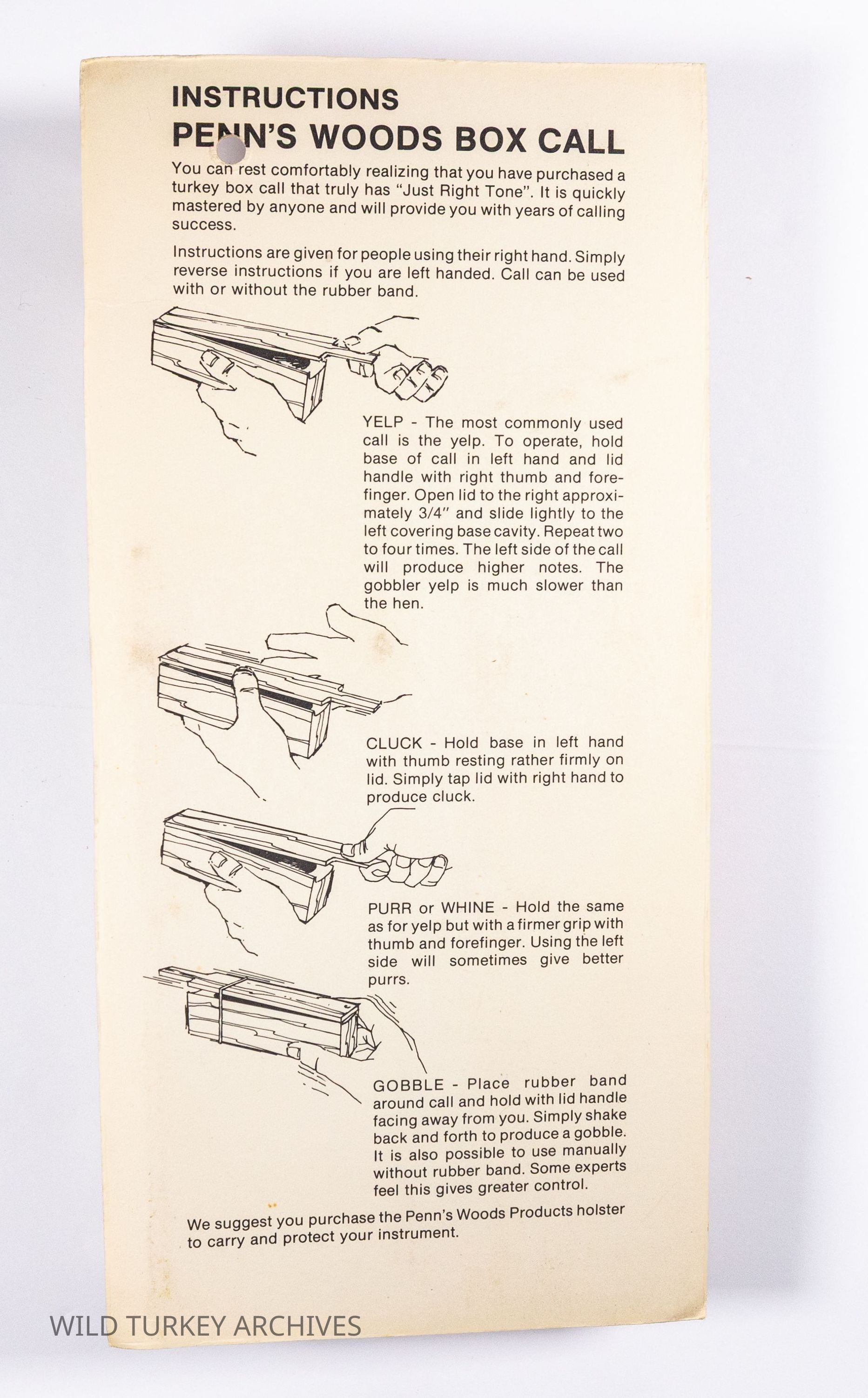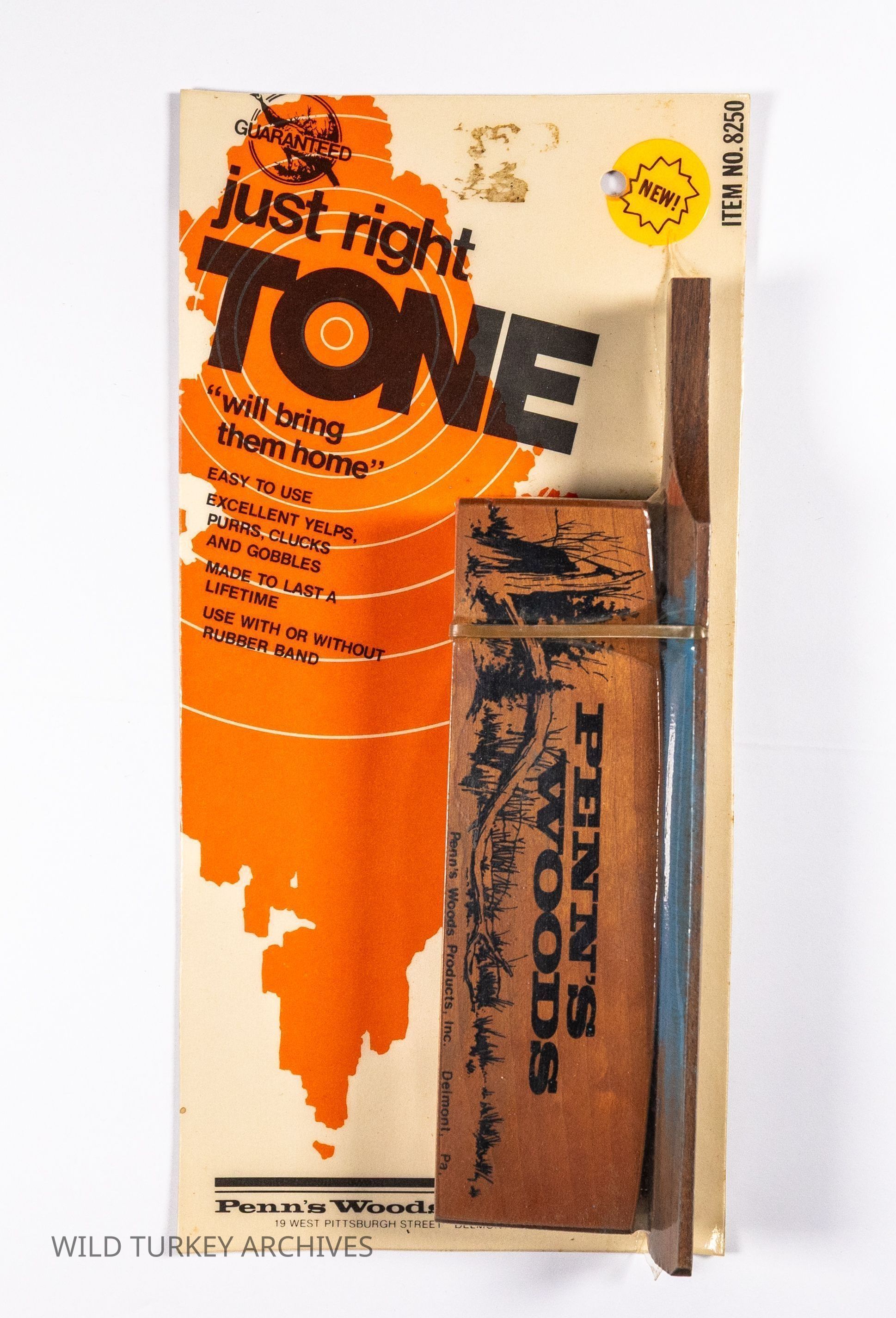Among the box calls offered byPenn's Woods was the "just right Tone," designed for ease of use. The Model 8250 wooden box call advertised was issued with a rubber band which could be used to create gobbles when held by the base and shook from side to side.Collection