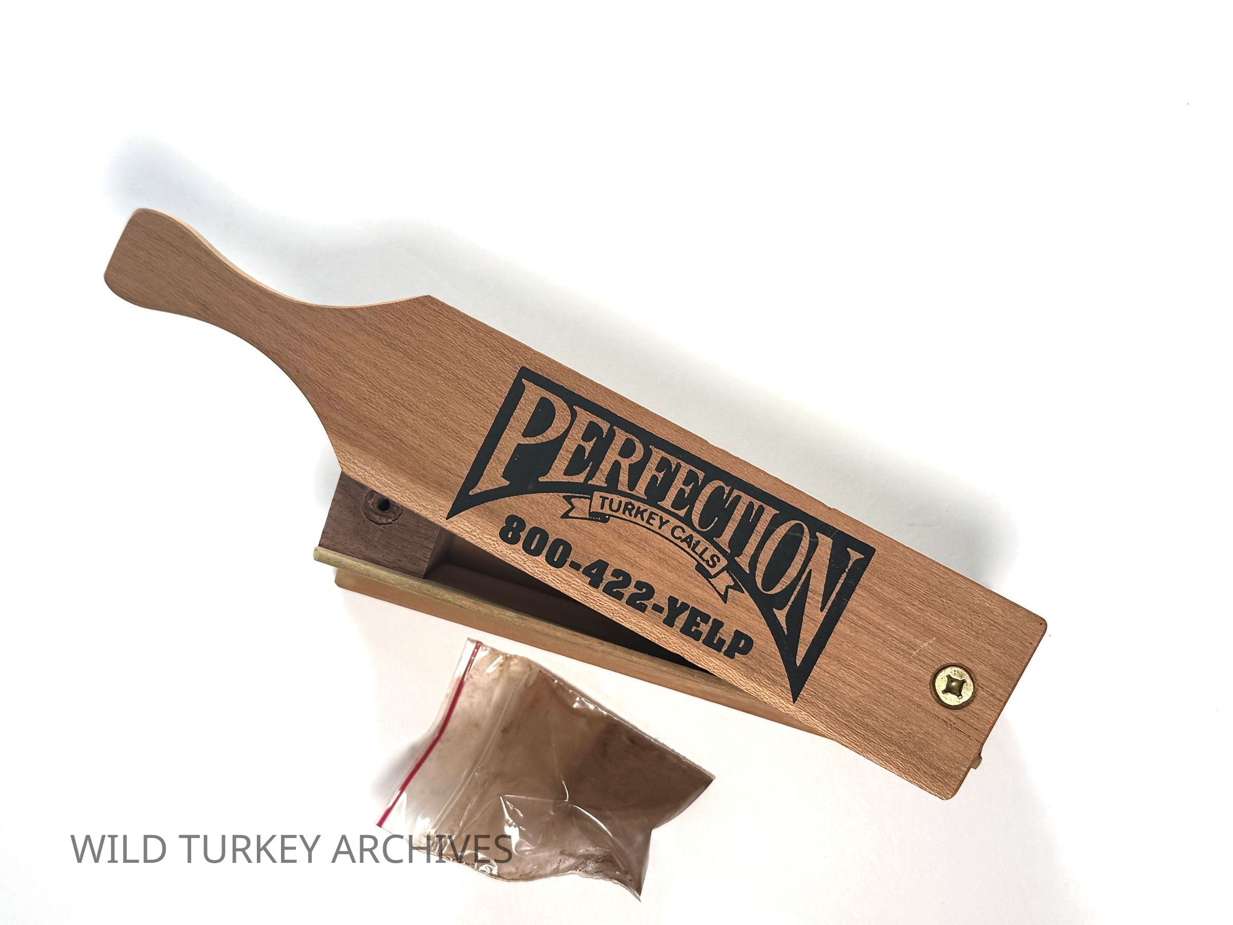 Perfection Turkey Calls catered to turkey hunters with calls of all styles, including friction calls. Box calls have been around since the 1800s, with Henry Gibson eventually patenting one in 1897. While M.L. Lynch calls are better known and were widely used, Gibson is the first we can accurately verify as using sawn-and-glued construction. This was a much more time- and resource-efficient way to make a large number of calls, compared with hand-hewing a box call base. The Perfection box call is an example of a sawn-and-glued construction, and was signed by owners Jim Clay and Tom Duvall in 2002. Friction calls, including box calls, generally require conditioning and/or a friction agent for the two surfaces to produce a sound. Chalk replaced rosin (used in early box calls) as the friction agent of choice.Collection