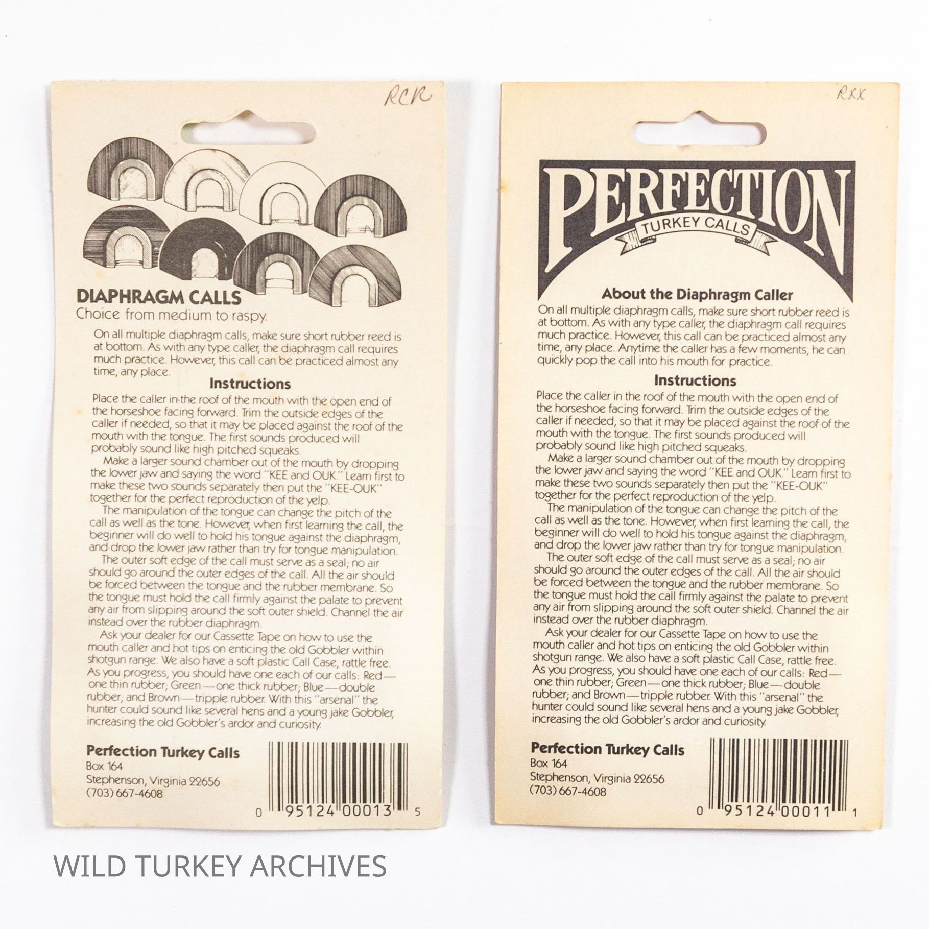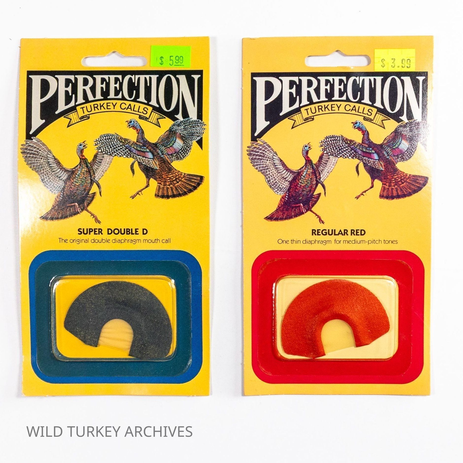 Perfection Turkey Calls was co-founded by Virginians Jim Clay and Tom Duvall in the early 1970s. Clay was a high school English instructor and Duvall a high school Woodworking and Industrial Arts teacher. Their timing coincided with the restoration of the wild turkey, and Perfection would be one of the new "modern turkey call companies" riding that wave. Some calls were made in-house and others were outsourced. Diaphragm calls were made in house, and the packaging evolved to be very attractive with bright colors. The Super Double D and Regular Red diaphragms also show how colors were used on the calls for branding and recognition.Collection