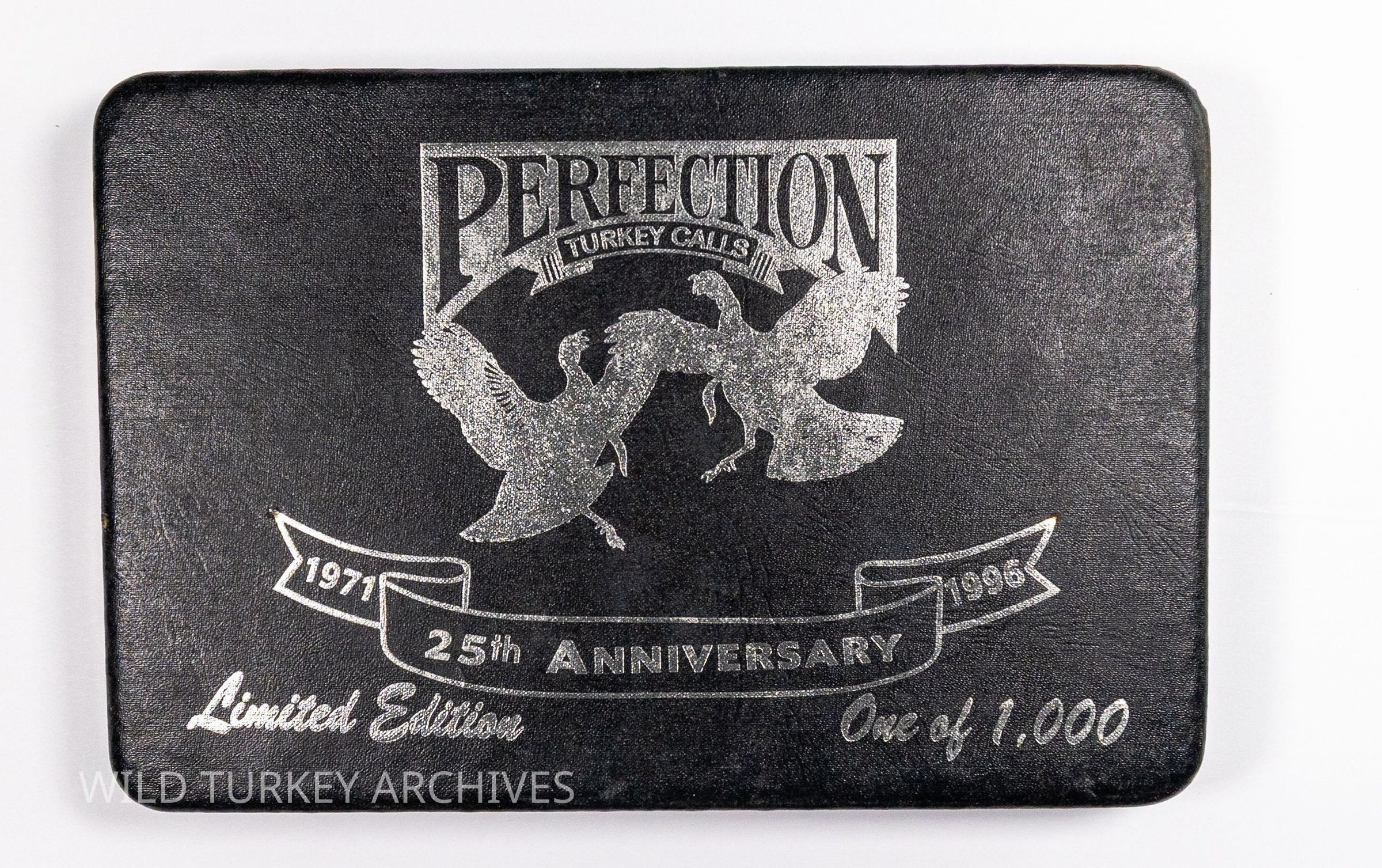 Perfection Turkey Calls was co-founded by Virginians Jim Clay and Tom Duvall in the early 1970s. Clay was a high school English instructor and Duvall a high school Woodworking and Industrial Arts teacher. Their timing coincided with the restoration of the wild turkey, and Perfection would be one of the new "modern turkey call companies" riding that wave. They did few limited editions sets, but a set of 1,000 hard plastic cases containing a glass pot call, single piece wood striker, turkey spur pin, and medallion were made to commemorate the company's 25th Anniversary in 1996. The calls themselves were not individually numbered, but all cases were more generically labeled "One of 1,000."Collection