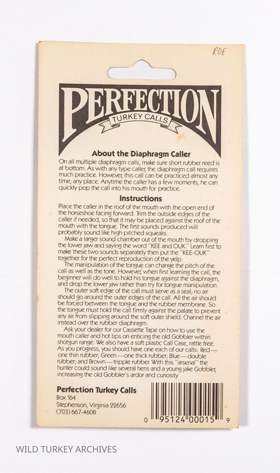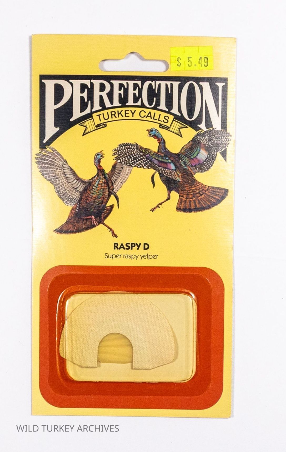 Perfection Turkey Calls was co-founded by Virginians Jim Clay and Tom Duvall in the early 1970s. Clay was a high school English instructor and Duvall a high school Woodworking and Industrial Arts teacher. Their timing coincided with the restoration of the wild turkey, and Perfection would be one of the new "modern turkey call companies" riding that wave. Some calls were made in-house and others were outsourced. Diaphragm calls were made in-house, and the packaging evolved to be very attractive with bright colors. This Raspy D diaphragm also show how colors were used on the calls for branding and recognition. Perfection advertised red as a single reed (a single note and generally easier for beginners), blue was a double reed, and brown was a triple reed (in general, more reeds created a complexity of sound and rasp for advanced users), though other colors (such as yellow here) were also used.Collection