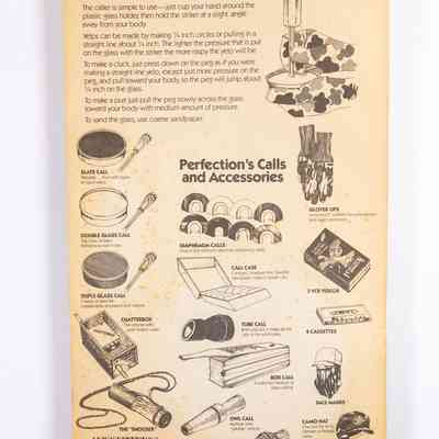 Perfection Turkey Calls catered to turkey hunters with calls of all styles, including friction calls. One style of friction call, dating back to at least the late 1800s, is the peg and slate call, which evolved to be the "pot call." One surface preferred by many hunters was glass. Glass is water-resistant (as was the acrylic dowel set into the striker paired with this call), and humidity and rain don't affect performance, unlike wood or slate. Using multiple layers of material within the pot produced more complex sounds, similar to multiple reed diaphragms, where vibrations across different surfaces produce a blend that can add rasp or tone. This model was the Triple Glass.
