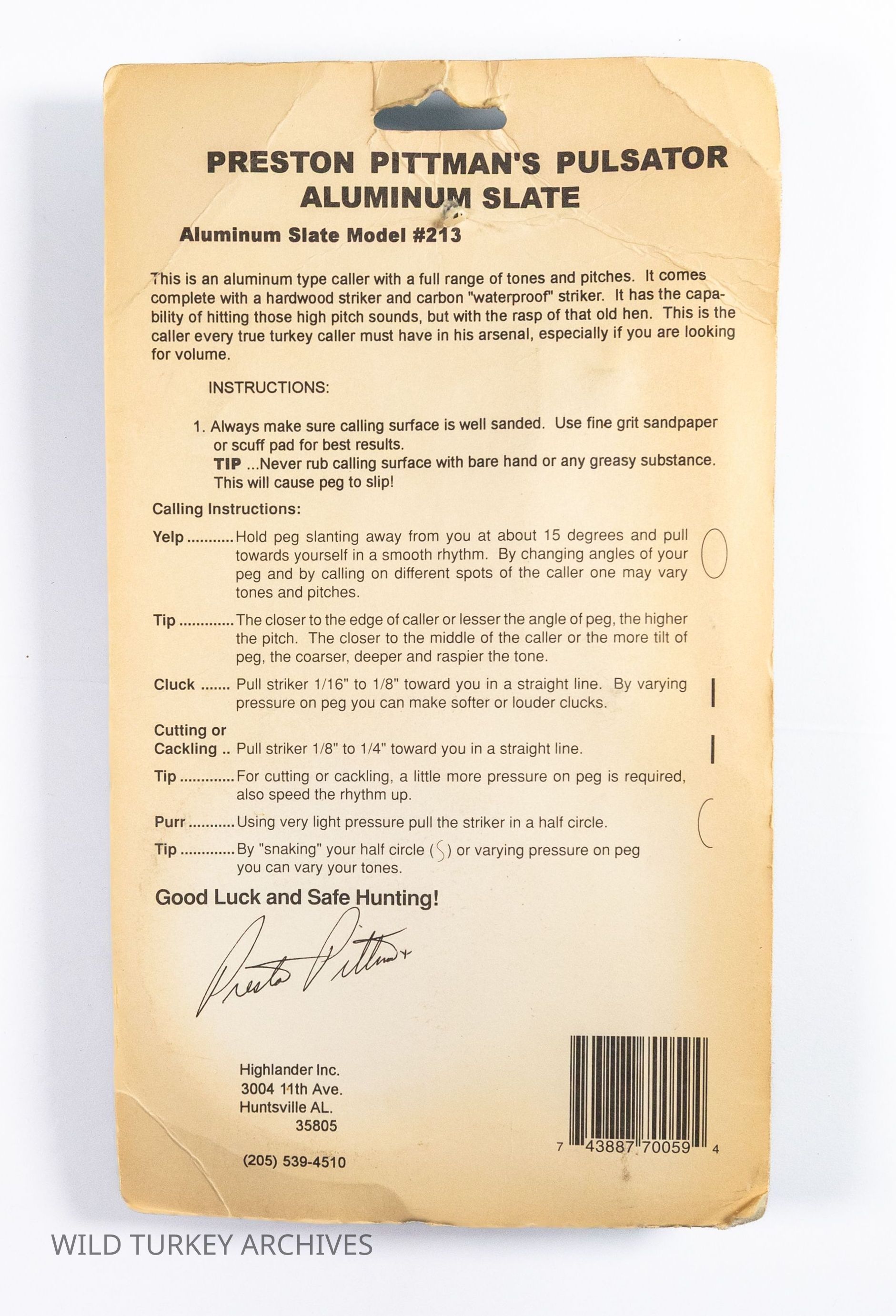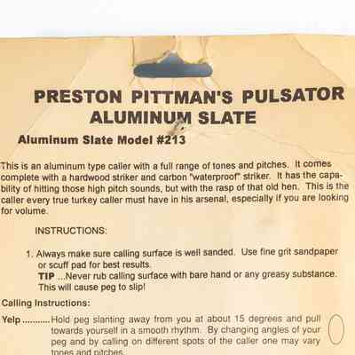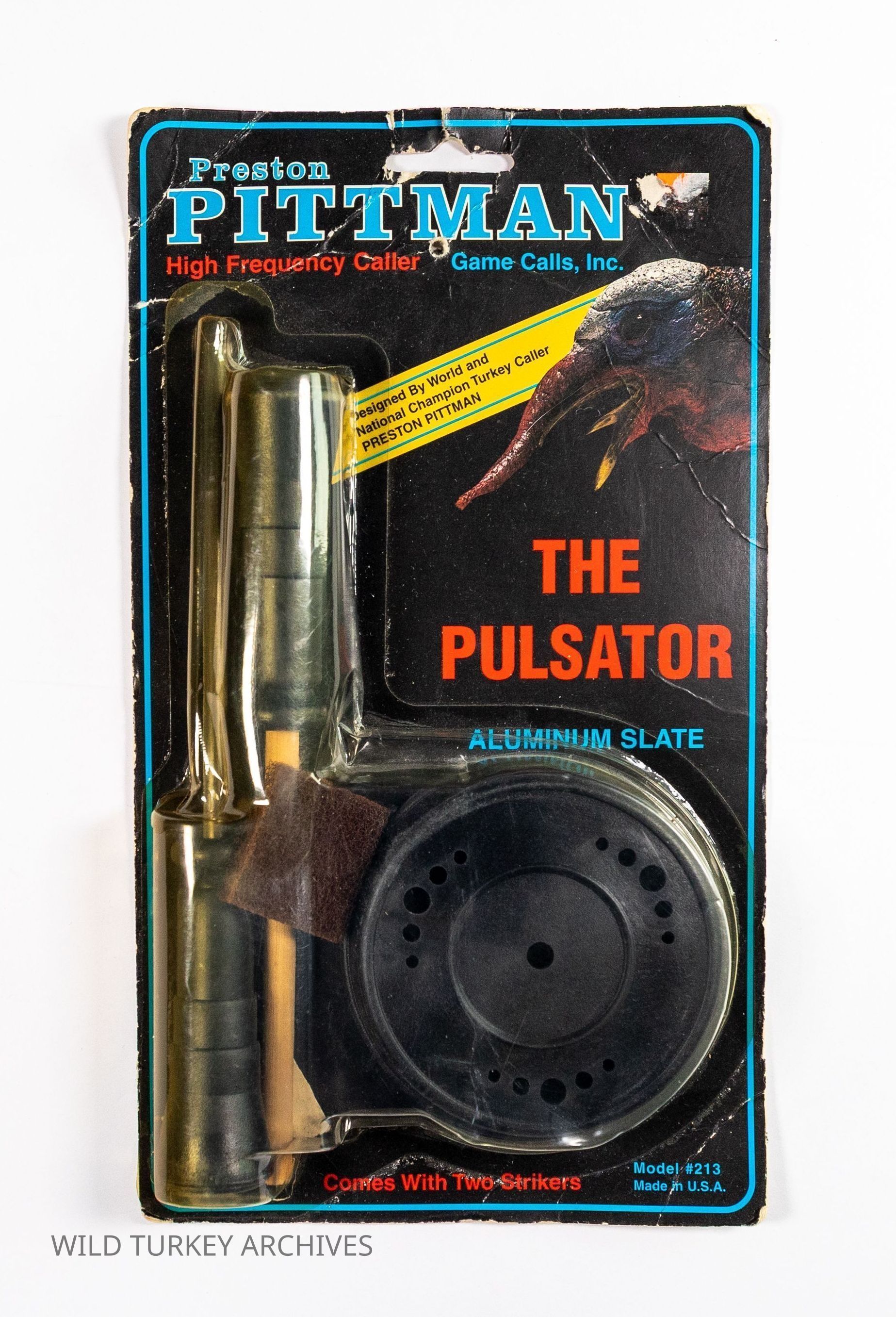 Champion turkey caller Preston Pittman's line of turkey calls included many pot-style calls. One of his friends, Mike Battey, was a well-known game call designer, and many of the Pittman Game Calls pot calls were of his design. Battey's personal favorite pot design was his "competition cup," a plastic pot (cup) made in an injection mold that featured three series of five holes on the back to emit sound. These pots had an integrated sound board and were used in this (and other designs) by many leading turkey call manufacturers. The Pulsator was one such. It had an aluminum surface, and was paired with two strikers, also with a Battey design, one with a hickory peg and one with carbon (thus advertised as "waterproof"). It was model 213.Collection