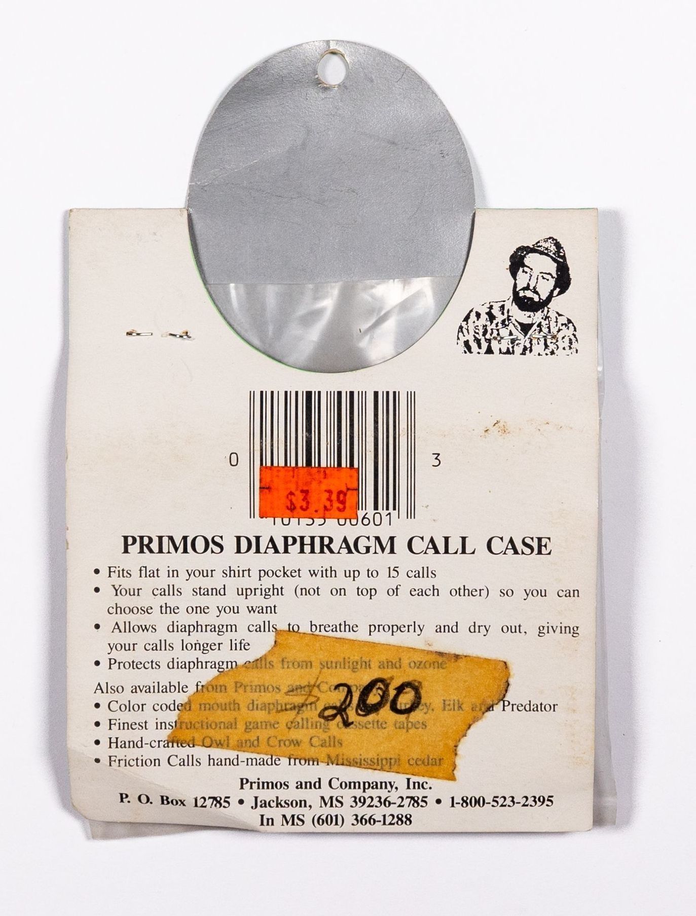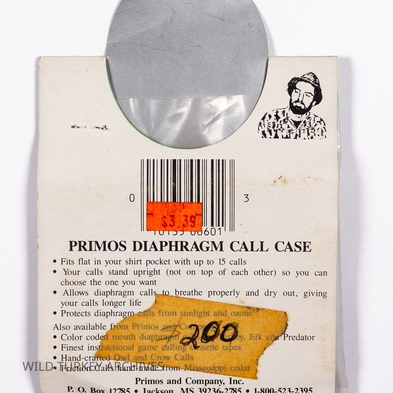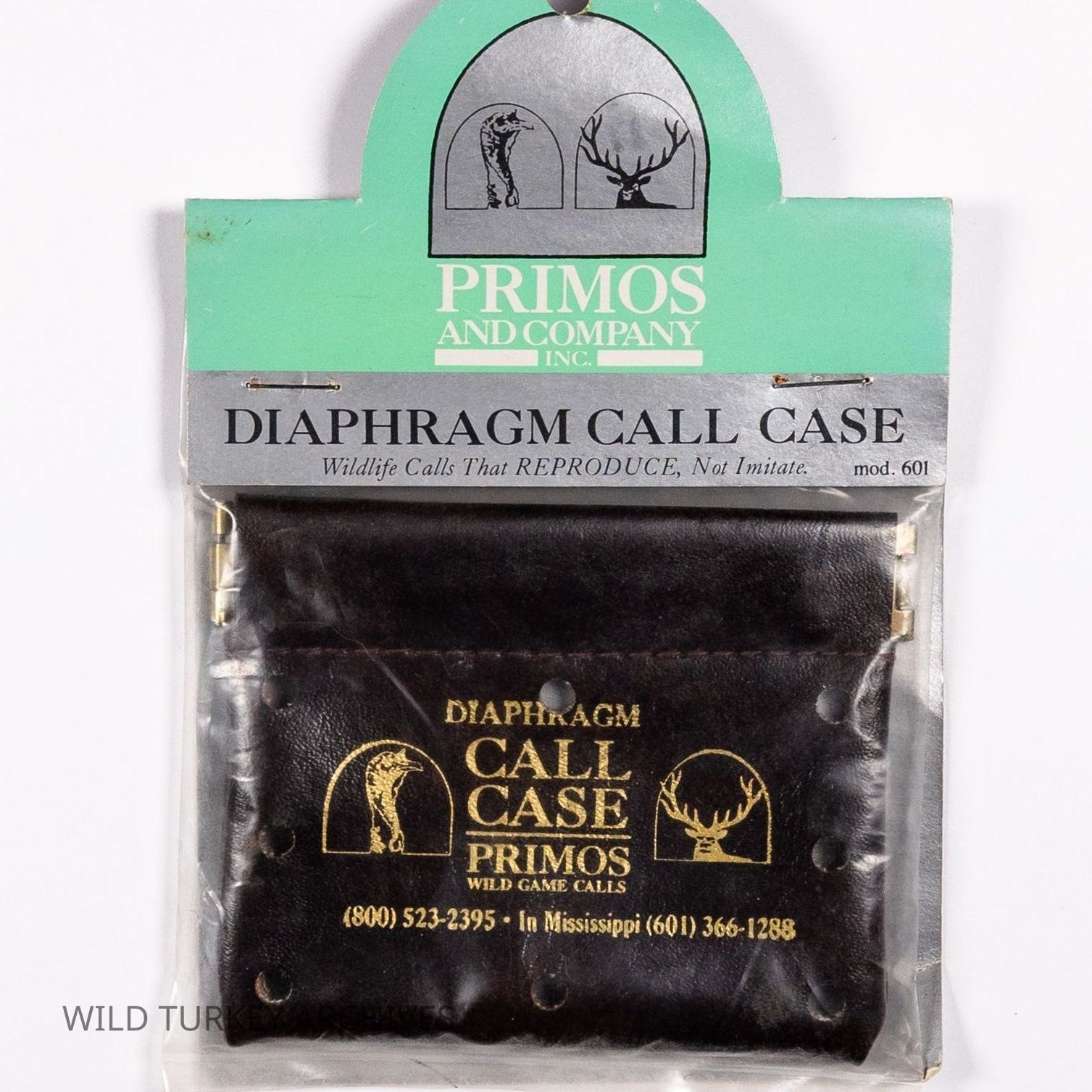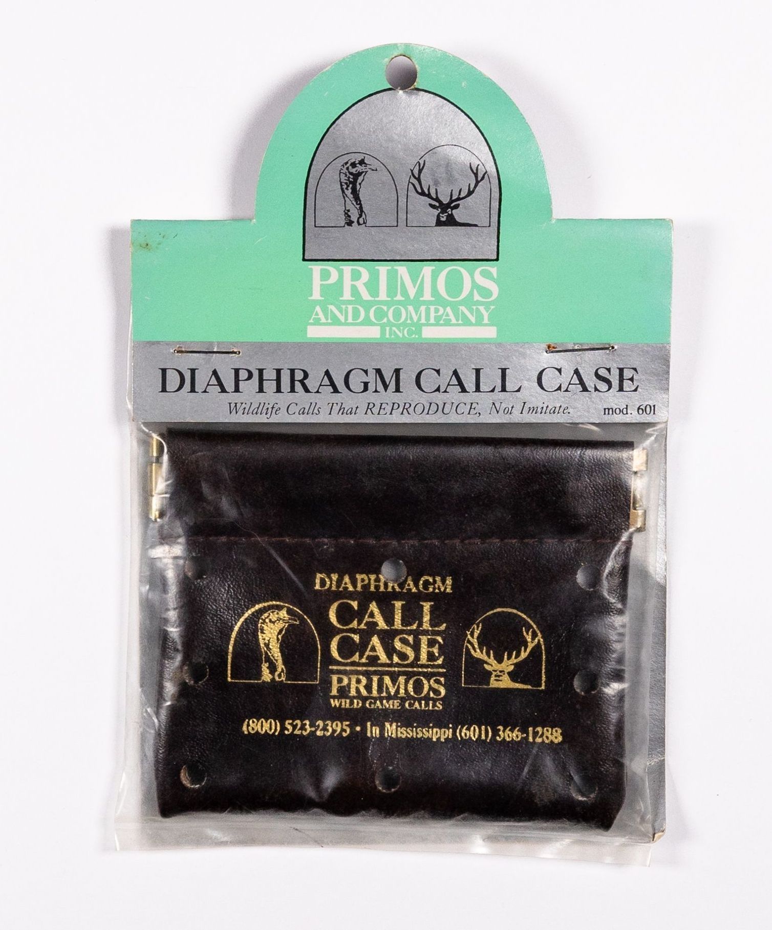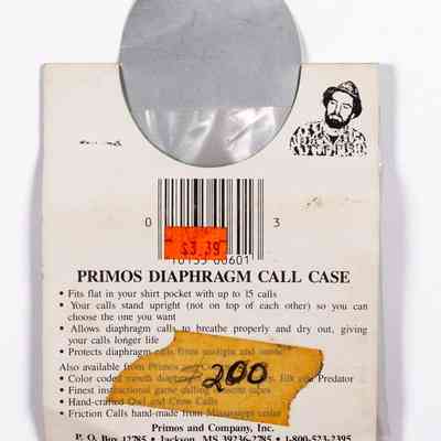 When Will Primos launched his company in 1976, the first name was Primos Yelpers, Inc. During the early to mid 1980s, the company would change names multiple times as it evolved. After PRIMOS YELPERS, INC. and PRIMOS, INC., PRIMOS & COMPANY would be the company's identity, even if only briefly. From 1987-1993, PRIMOS WILD GAME CALLS became the company name. The call case pictured has the latter company name but is contained in older packaging. The call case as well as the packaging has the "tombstone" logo of a gobbler head and of a bull elk, which show the company's extension of its game call line to multiple species. The package also has the early slogan "Wildlife Calls That REPRODUCE, Not Imitate." It is Moeld 601.Collection