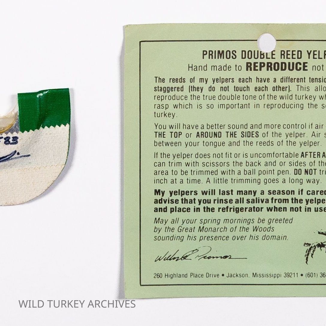 When Will Primos launched his company in 1976, he was solely making diaphragm calls. Stacked frame calls were especially popular for the quality of wild turkey language they reproduced. This is a Double Reed Yelper, consisting of two stacked aluminum frames, each with a reed. Will Primos dated this call in 1983.Collection