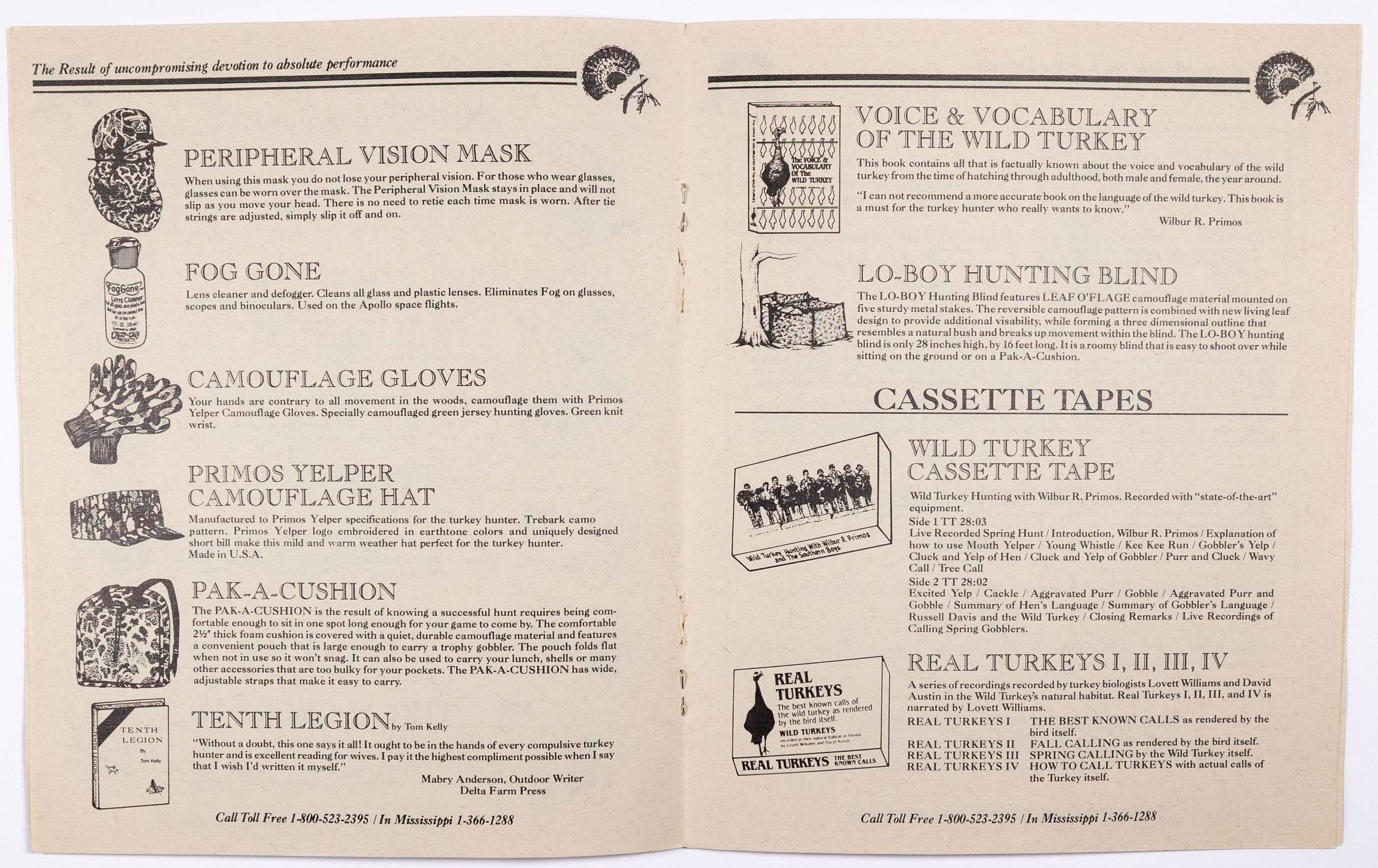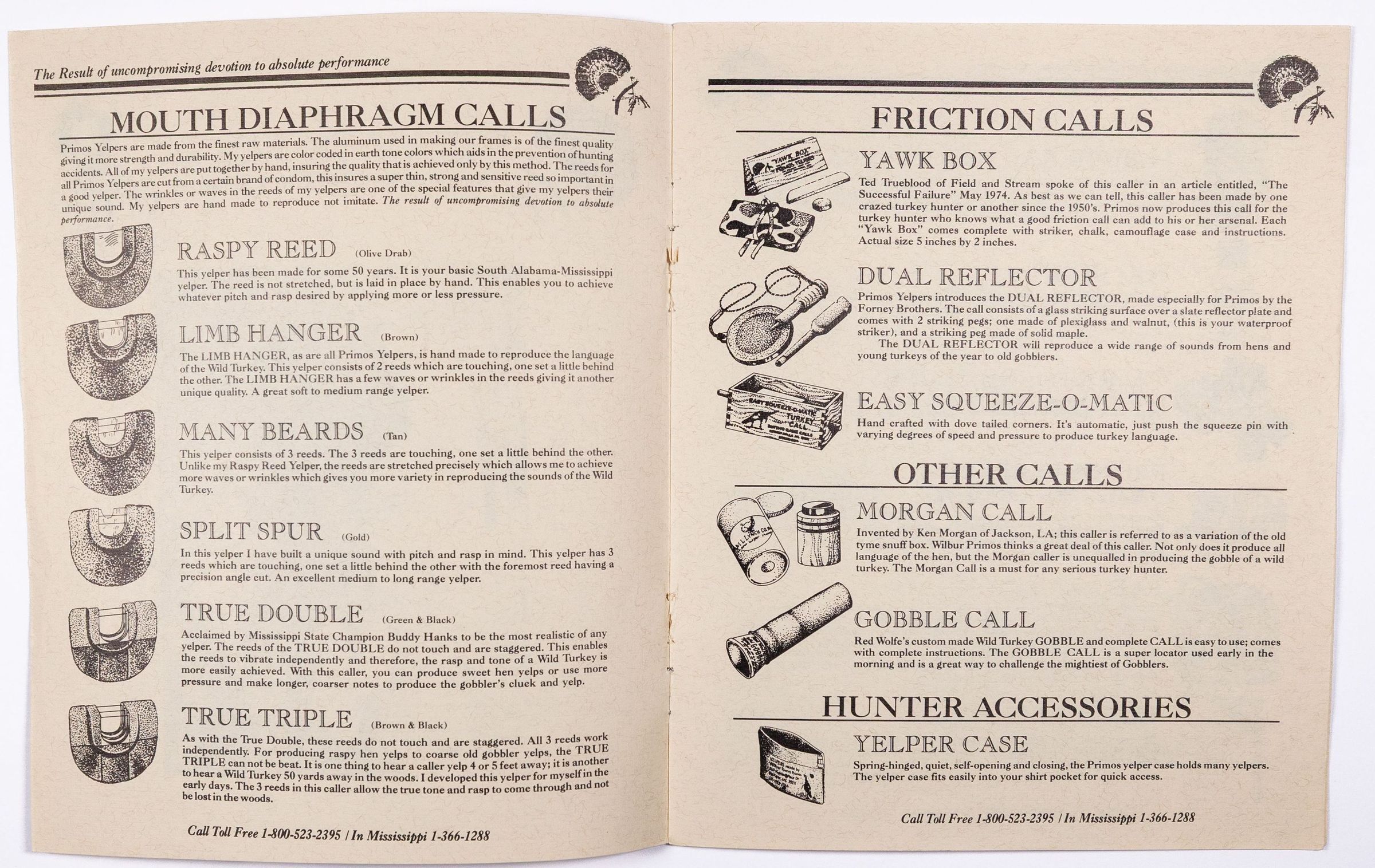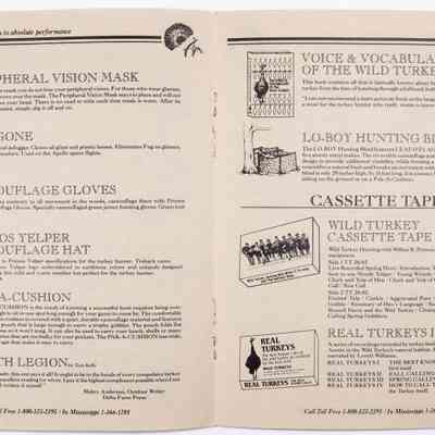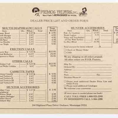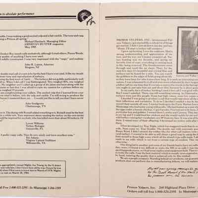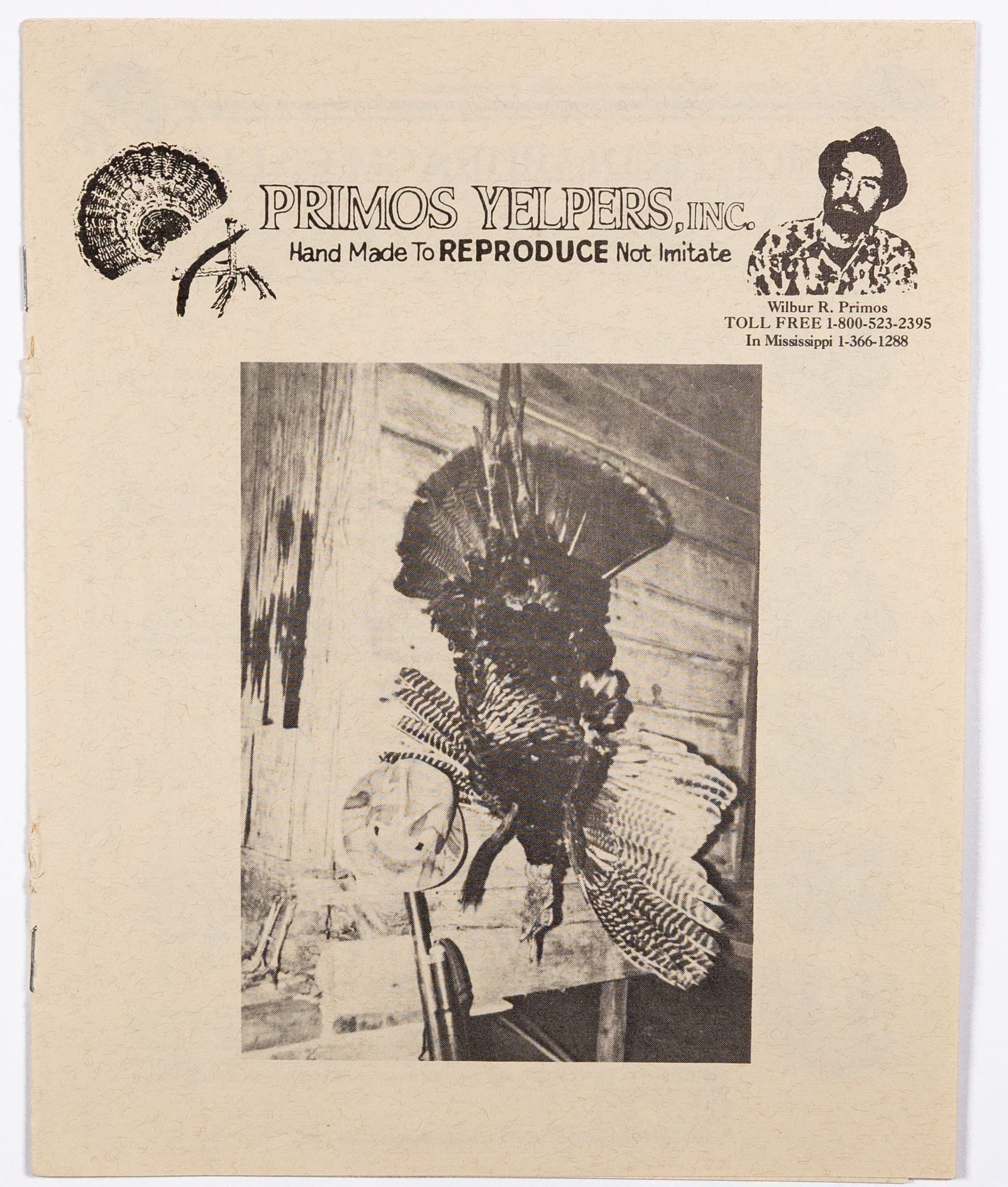 When Will Primos launched his company in 1976, the first name was Primos Yelpers, Inc. This is very likely the first catalog, circa 1983-1986. Per Will Primos, the catalog was done on stationery paper and the pages were staped together. The product offerings include items Primos developed, such as diaphragm calls, as well as products outsourced to others. The sketch of young Wilbur Primos with a close cropped beard and a fedora hat was done by Mr. Sherill Nelson. It also has the early slogan "Wildlife Calls That REPRODUCE, Not Imitate."Collection