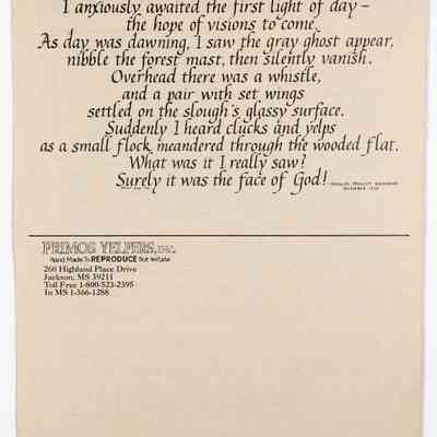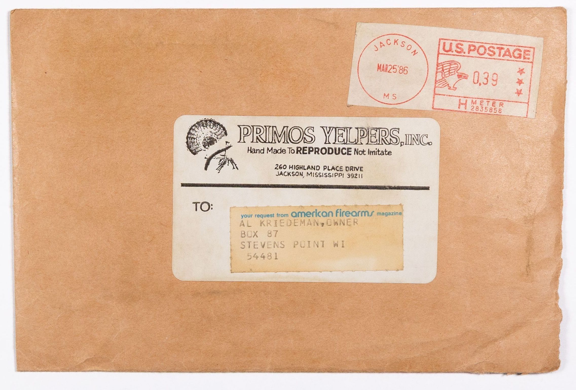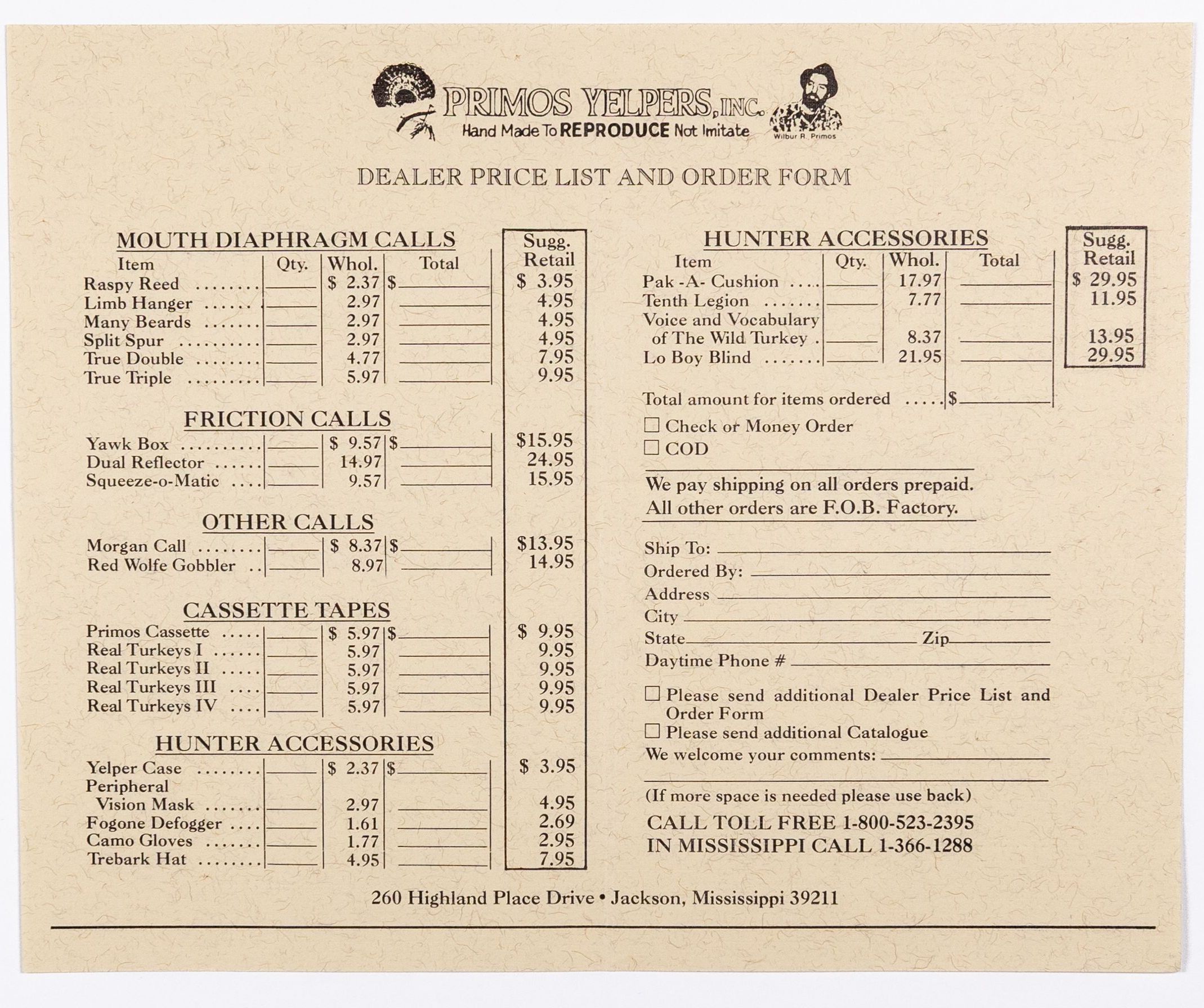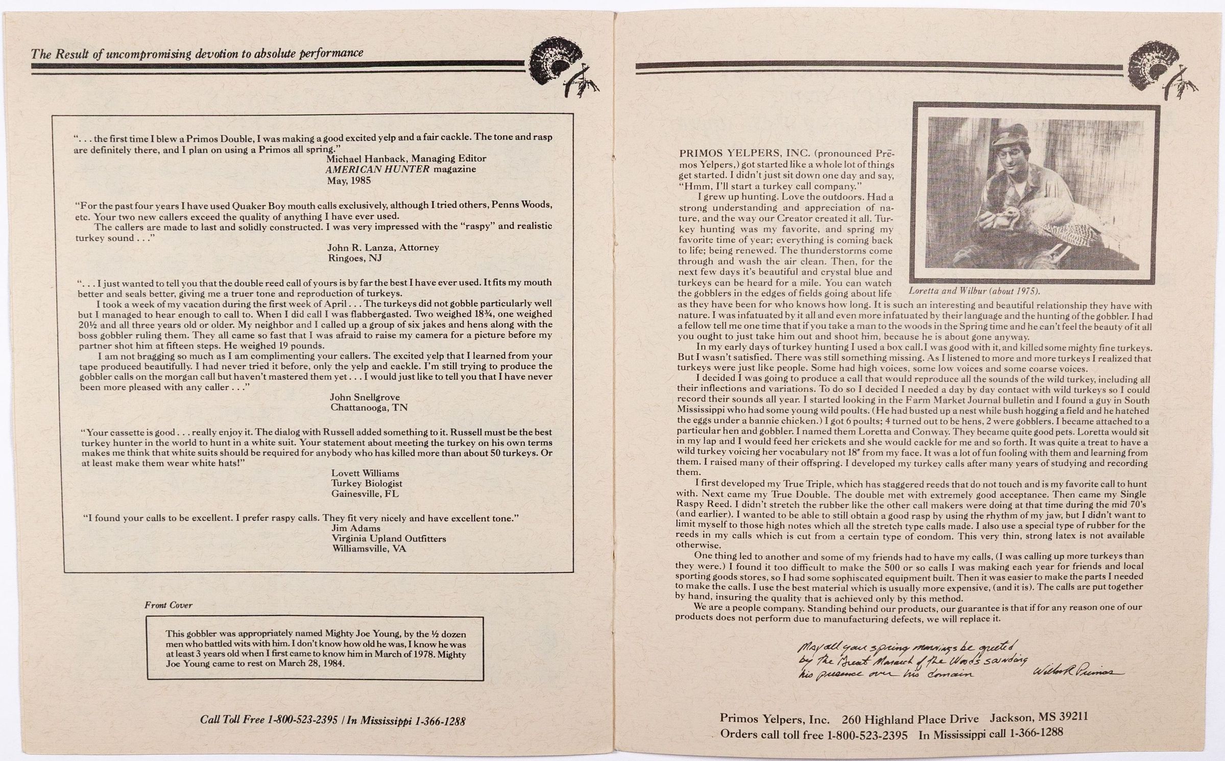 When Will Primos launched his company in 1976, the first name was Primos Yelpers, Inc. This is very likely the first catalog, circa 1983-1986. Per Will Primos, the catalog was done on stationery paper and the pages were staped together. The product offerings include items Primos developed, such as diaphragm calls, as well as products outsourced to others. The sketch of young Wilbur Primos with a close cropped beard and a fedora hat was done by Mr. Sherill Nelson. It also has the early slogan "Wildlife Calls That REPRODUCE, Not Imitate."Collection
