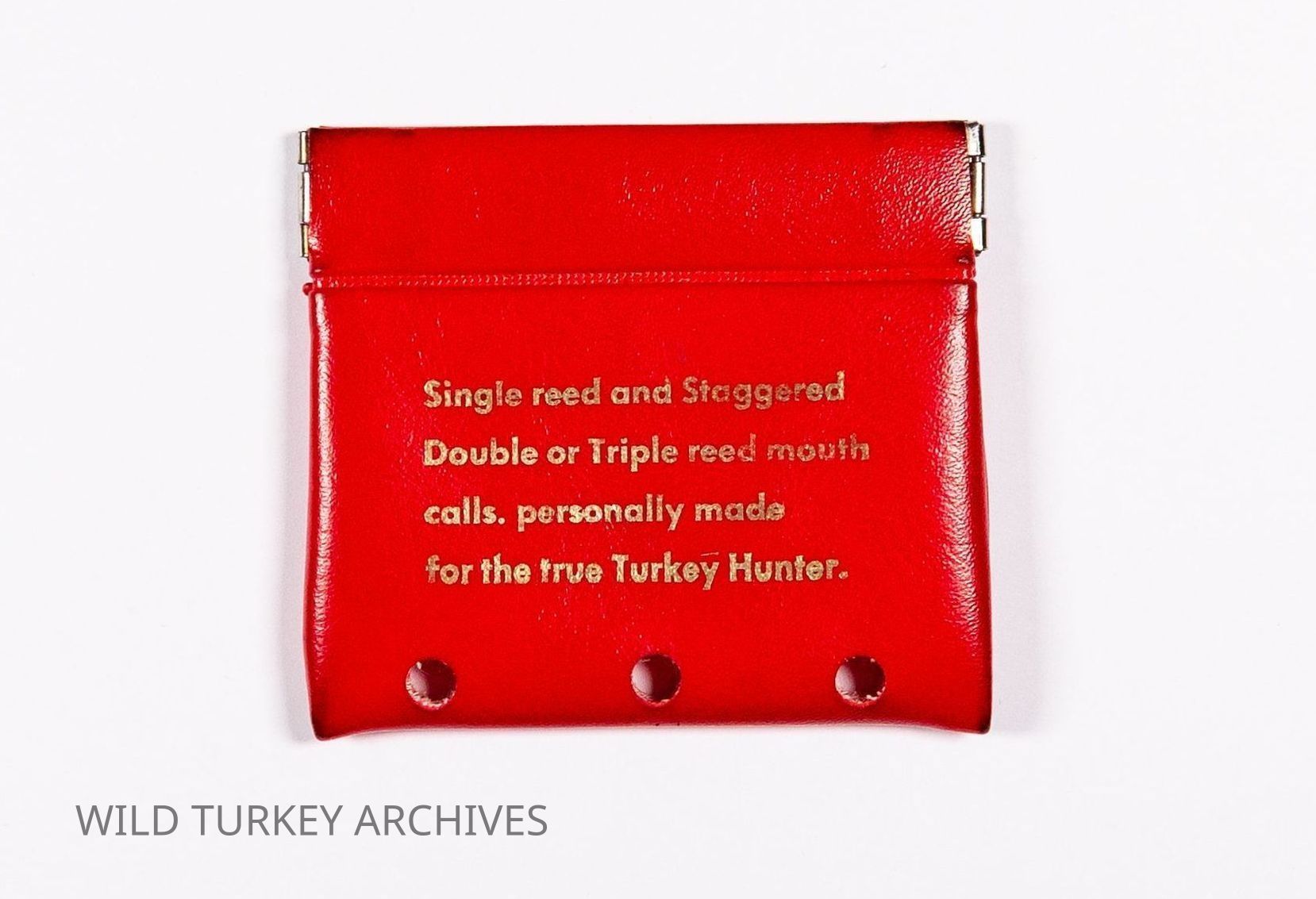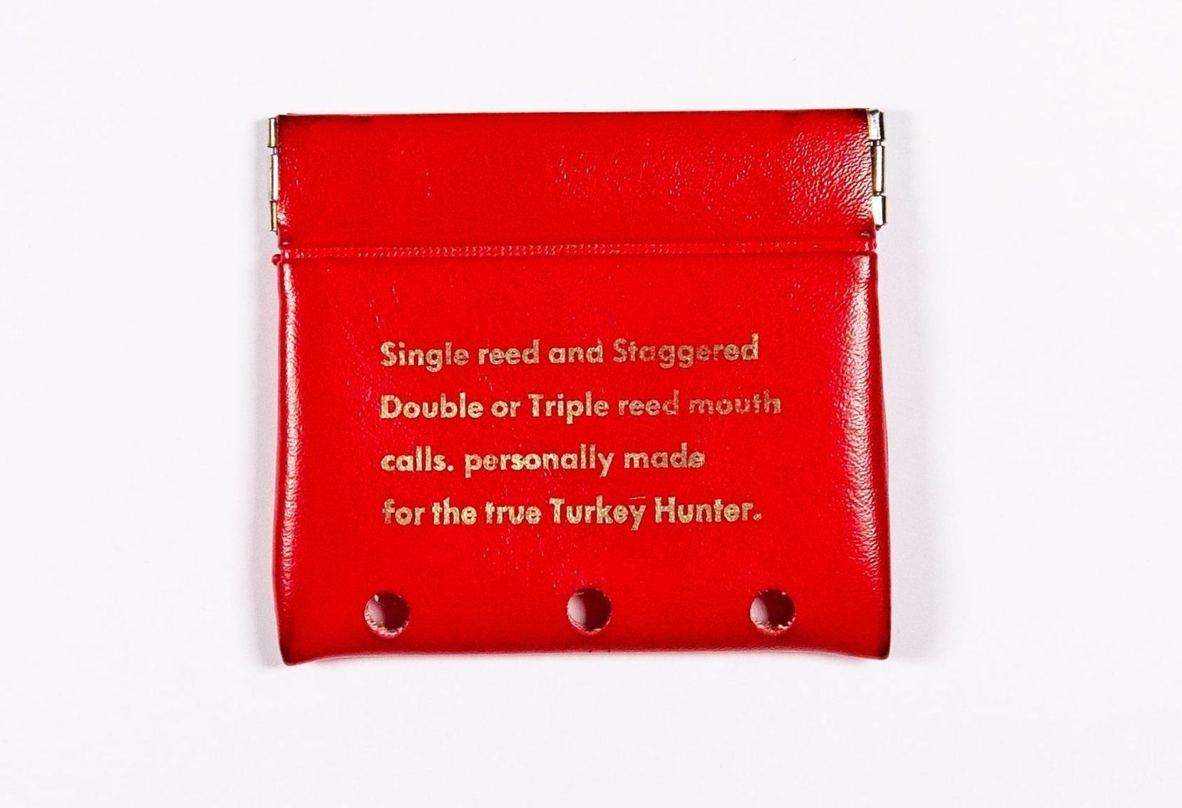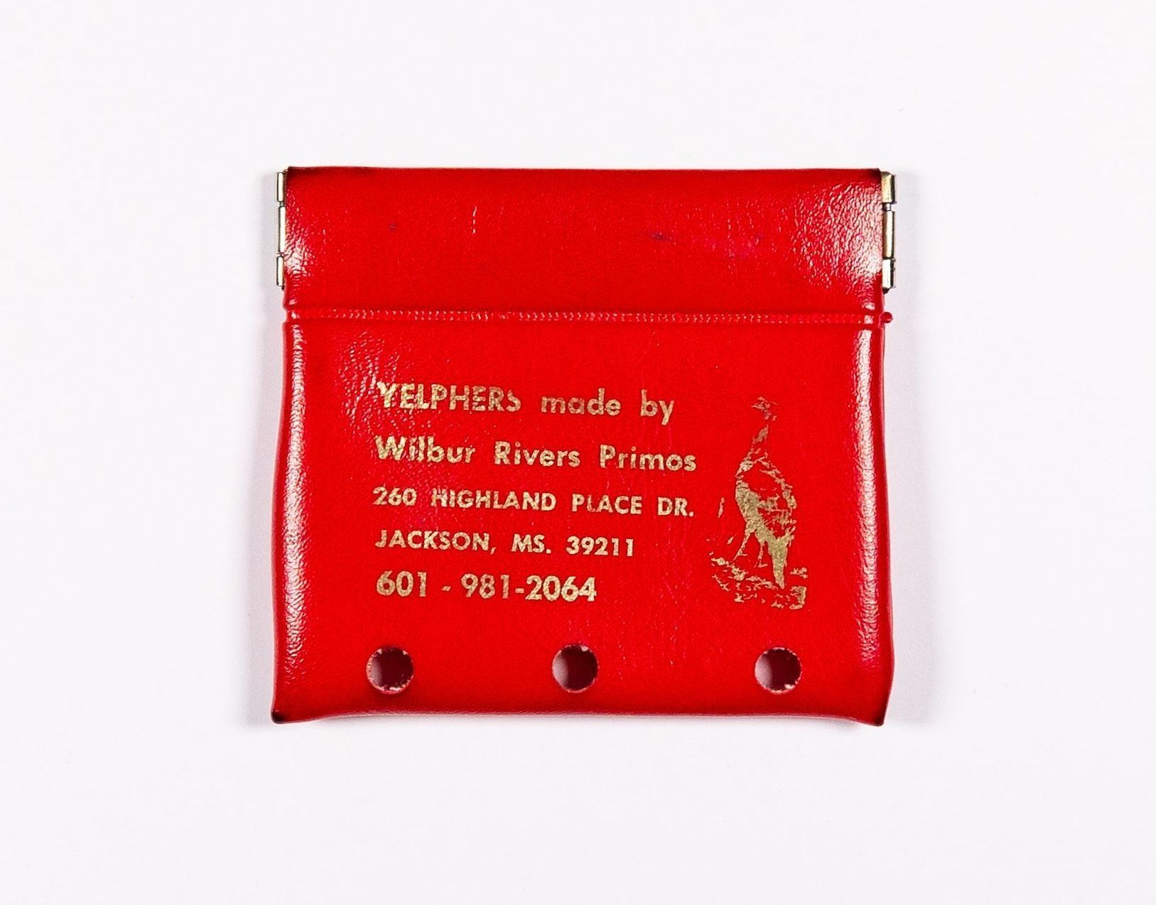 Primos Yelpers was the first name of the company founded by Wilbur Rivers Primos. He put his full name in gold print on the first diaphragm or "yelper" he would offer. The case was fire-engine red. The story of the case was given in the book Yelp & Gobble, Inc. by Brent Rogers. “The Yelper Case was inspired by my friend Vernon Phillips,” Will Primos said. “His nickname was Dirt, and around 1975, he came over one day and said, “The Bank of Canton, MS is giving these coin purses away for loose change. I think it would make a perfect yelper case.” Primos saw the practicality of a way for customers to carry his mouth yelpers and “found a supply place for promotional products and ordered some.” He placed the minimum order for 250 and had “Yelpers made by Wilbur River Primos” screen-printed in gold onto the fire-engine red case. The instant he received them, he was dismayed to see “Yelpers” misspelled as “Yelphers.” I obtained one from a former PRIMOS® ProStaffer, but I have never seen one for sale. So, I asked Primos what he did with the misspelled cases. “I sold ‘em!” said the business-first Primos. “I think they were $4.99 each.” Another facet of the “Yelpher” story illustrates Will’s personality. He said, “When I got ‘em, I used a hole punch to give ‘em some air. Otherwise, it would make a perfect petri dish for bacteria.” That is true, given a call would go back and forth between the case and the user’s mouth, often in hot, humid conditions.Collection