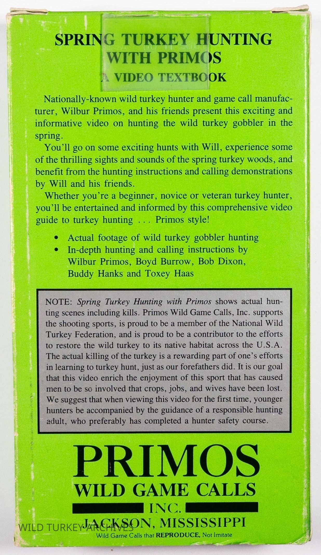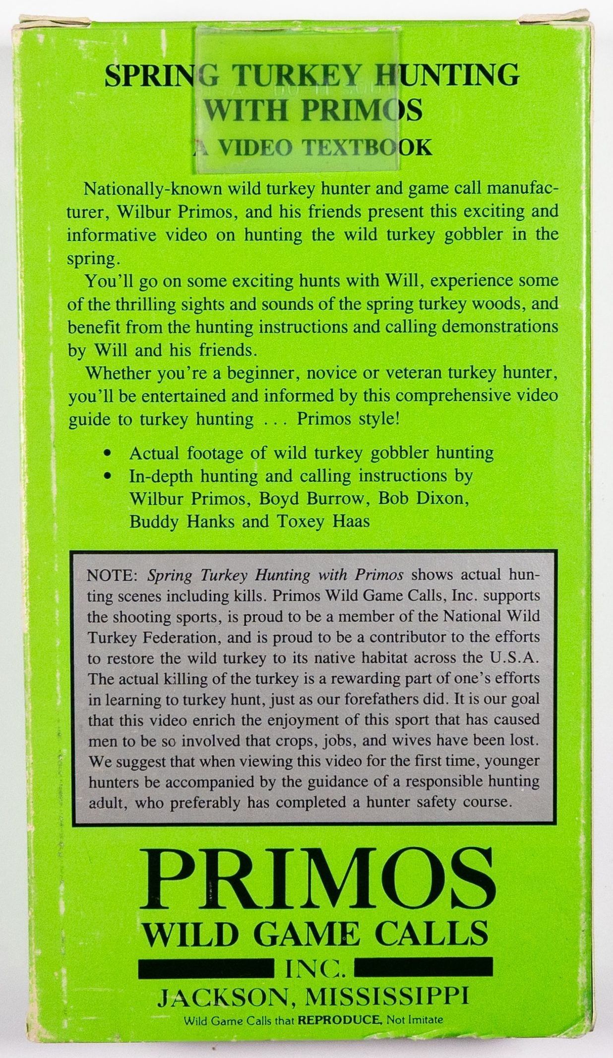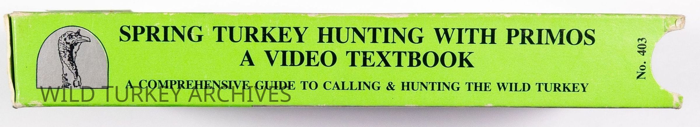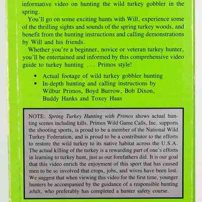 While recognized for the blockbuster series The TRUTH, the inaugural turkey hunting video by Primos came in 1987 and was an instructional videocassette entitled Spring Turkey Hunting with Primos, A Video Textbook. The company understood the opportunity to educate new turkey hunters as the restoration of the wild turkey created new opportunity across the nation. This tape was 70 minutes long and labeled Model 403.Collection