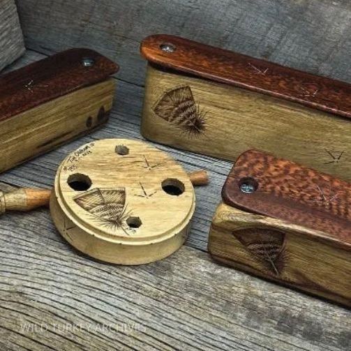 He builds pot calls, short boxes, hen boxes, and trumpets. He has two styles of calls, both of which are built to hunt: artwork and field grade.