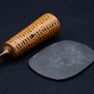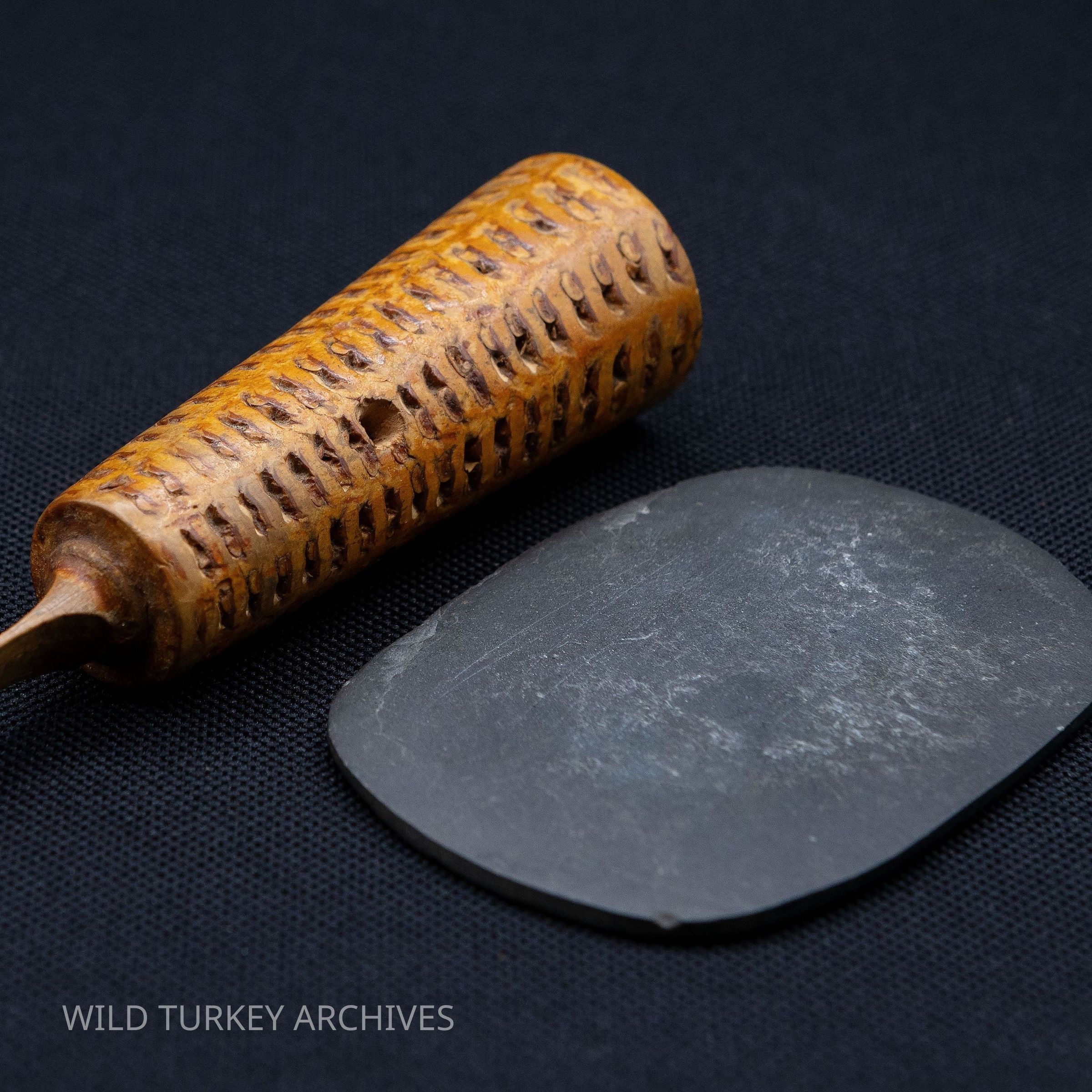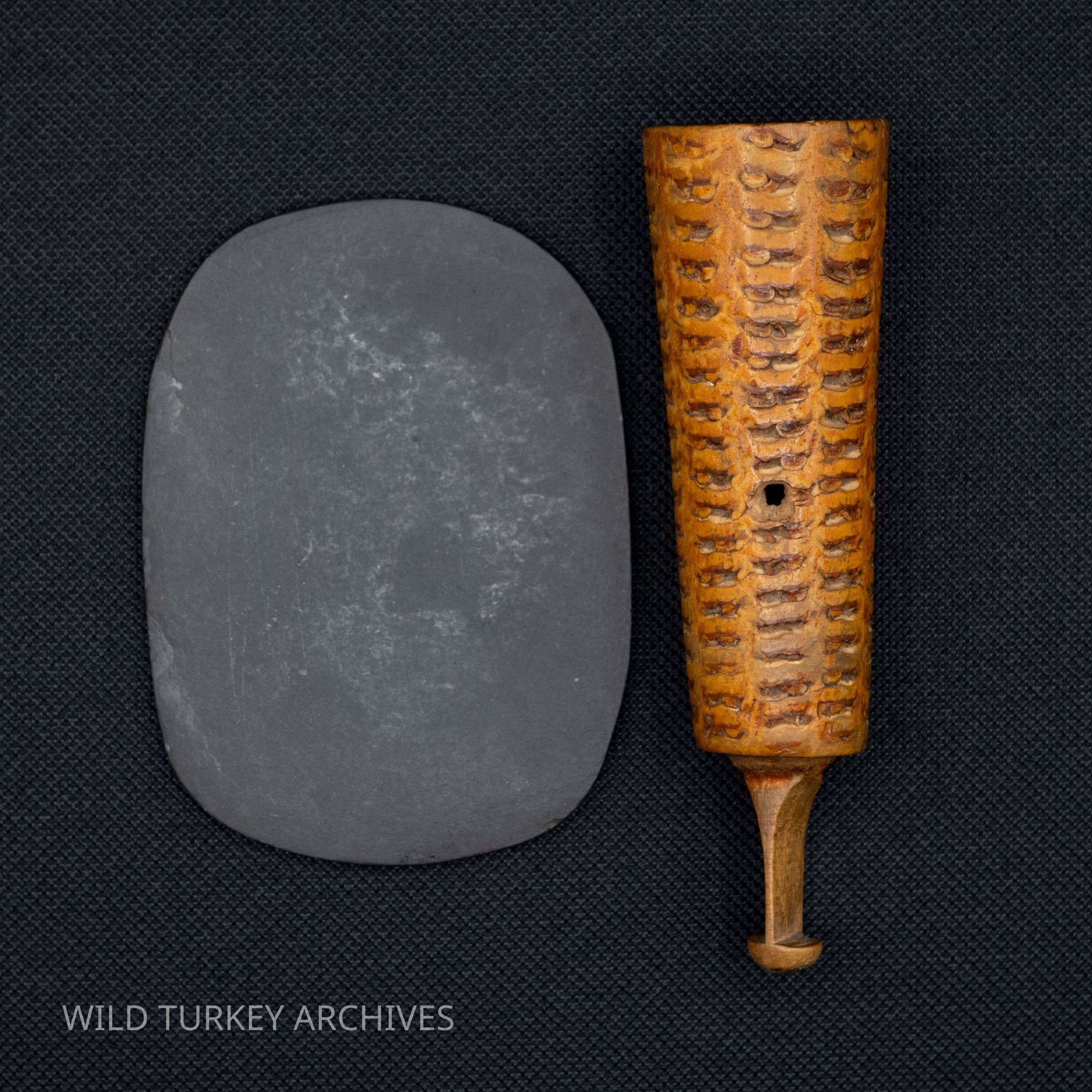 As friction calls gained popularity in the 1800s, we have evidence in old sporting journals and stories of early peg-and-slate-style calls. The 1883 Sportsman’s Gazetteer highlights a “nail call,” with a nail driven in one piece of wood rubbed against a slate or soapstone. The peg and slate call to be patented was by Dr. Wade Hampton Saunders (1876-1927) of Roanoke, Virginia. He received U.S. Patent #1,034,307 on July 30, 1912. In it he claimed a “Turkey call, comprising a hollow tone tube constructed of a section of corn cob terminating at one end in a blade stylus needle having a spherical head, adapted to be held against a piece of slate or the like held in the hollow of one’s hand and against ones thigh in moving frictional contact, causing a vibration of the blade stylus needle, in imitation of the note of the wild turkey.” He would name his call The Simplex, which was an effective way to market its user-friendliness.Collection