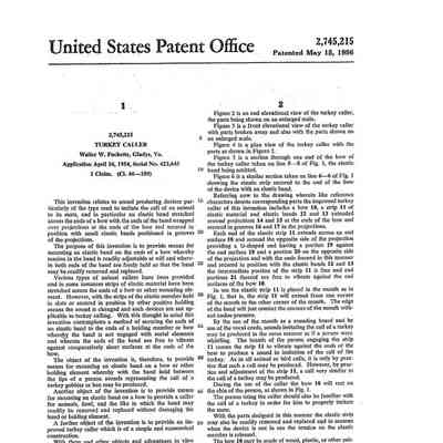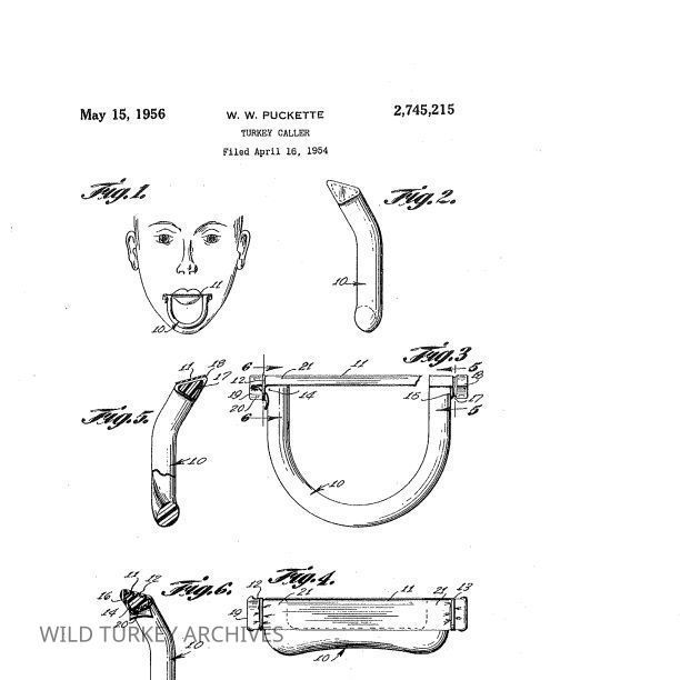 Walter W. Puckette would apply for a patent for an external mouth diaphragm on April 16, 1954. Patent 2,745,215 would be issued for his "Turkey Caller" on May 15, 1956. For turkey hunters with a gag reflex, it may have been a call they sought out. LIke the diaphragm call that Henry P. Bridges originally patented in 1921, these calls had great practicality in allowing the hunter a hands-free call.Created By