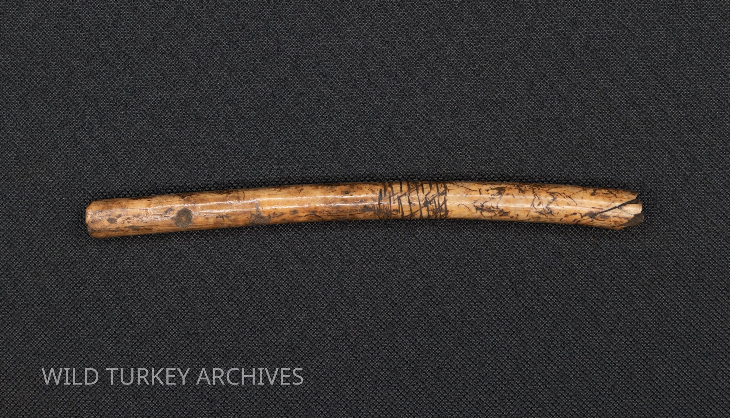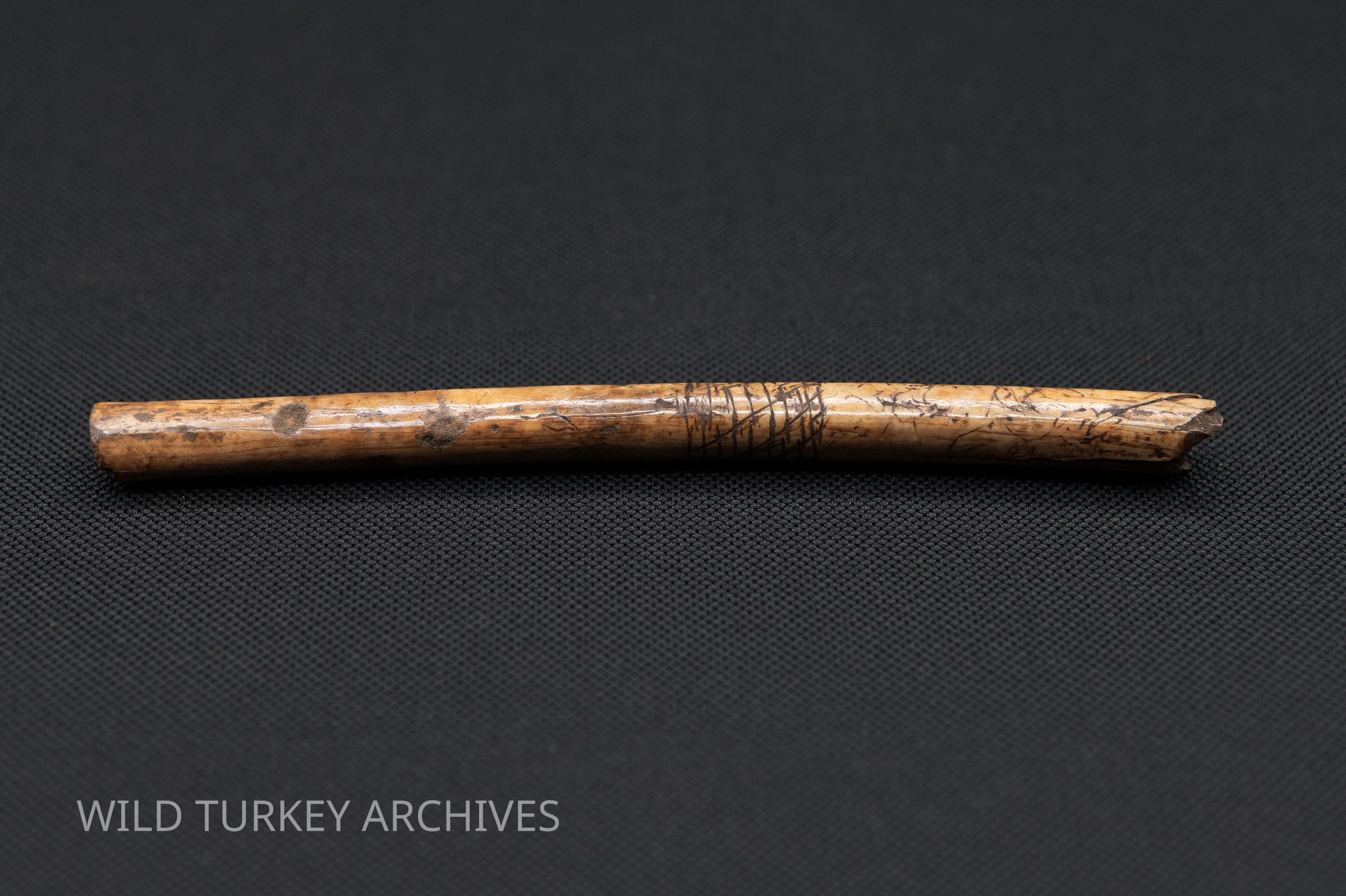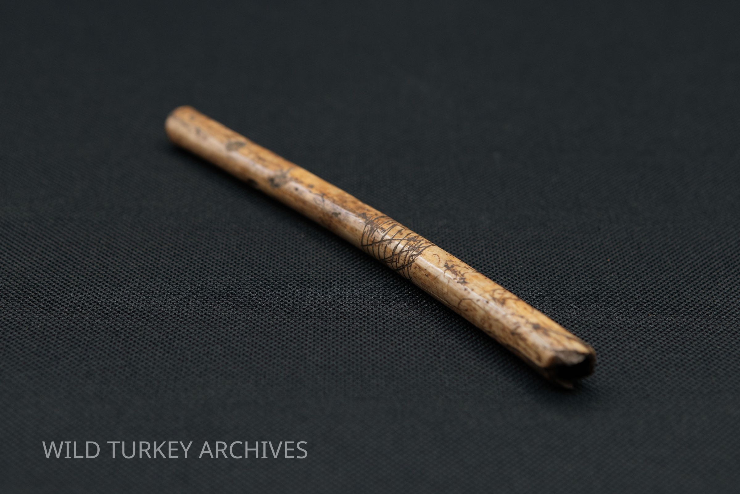 This ulna bone was taken from the wing of a wild turkey by Native Americans, and it bears etching which may have decorative or cultural significance.Collection