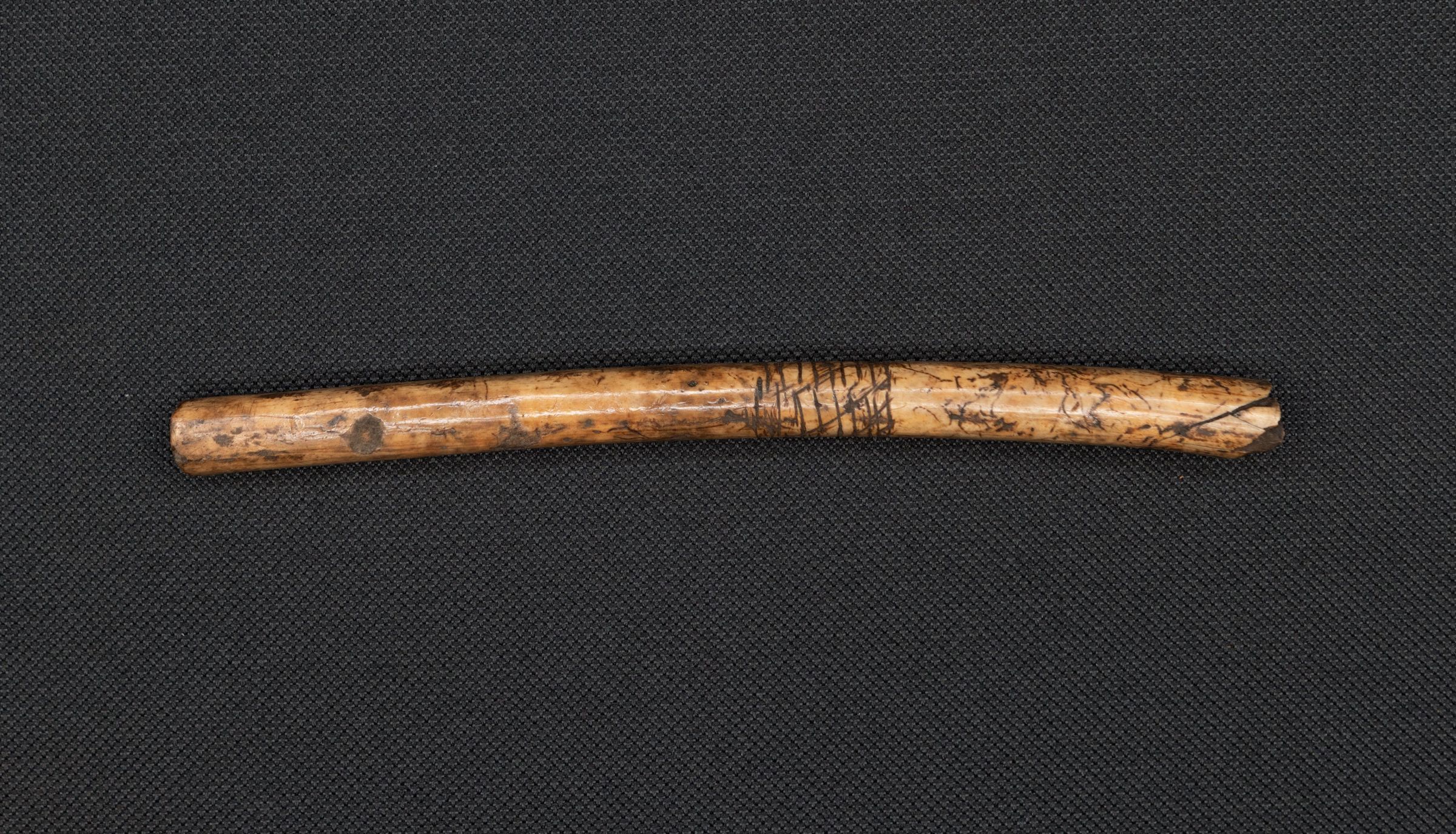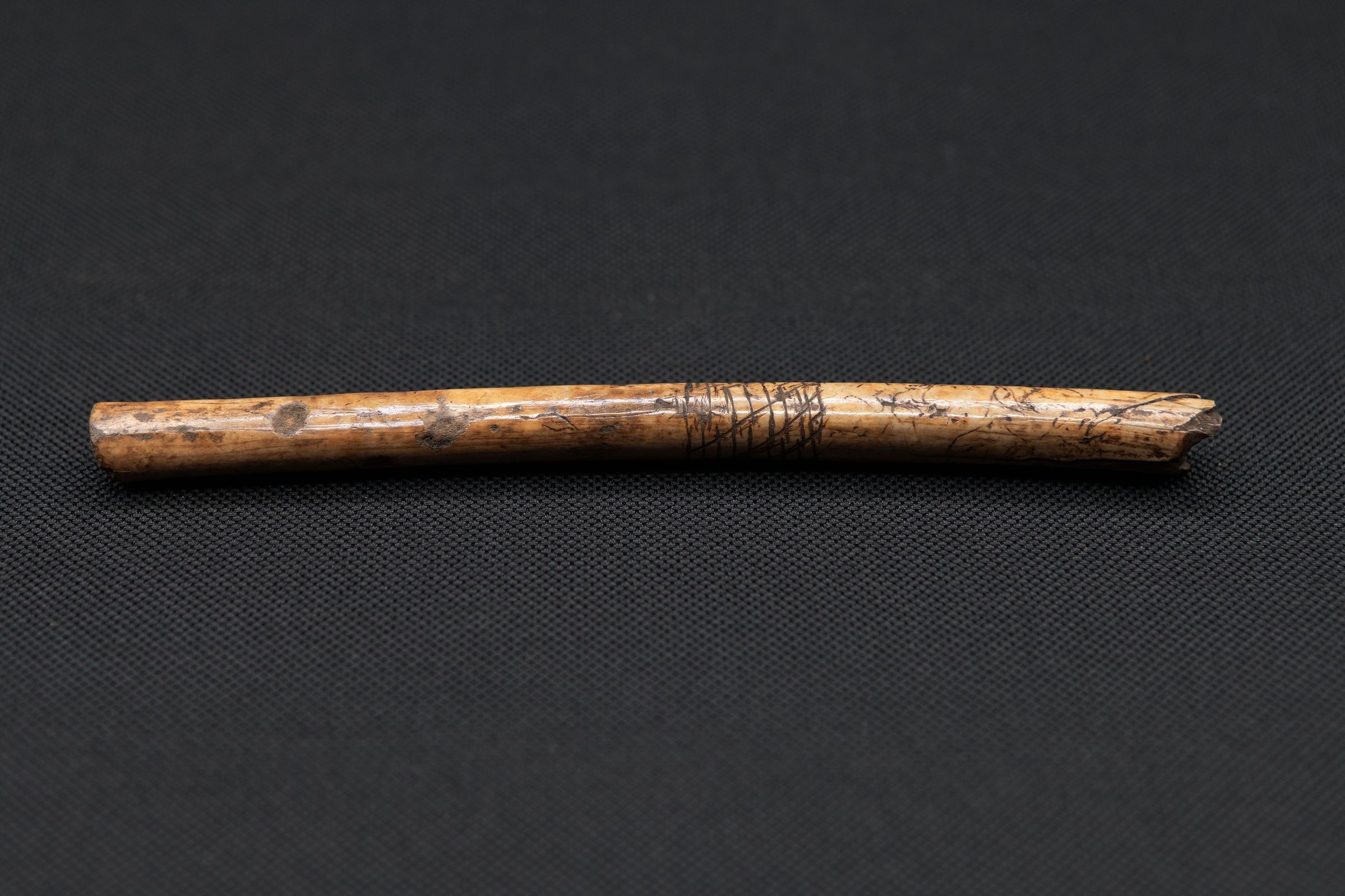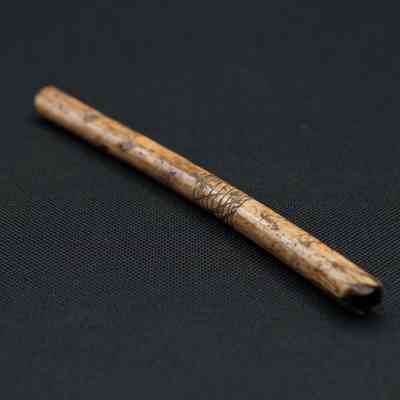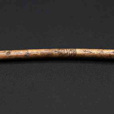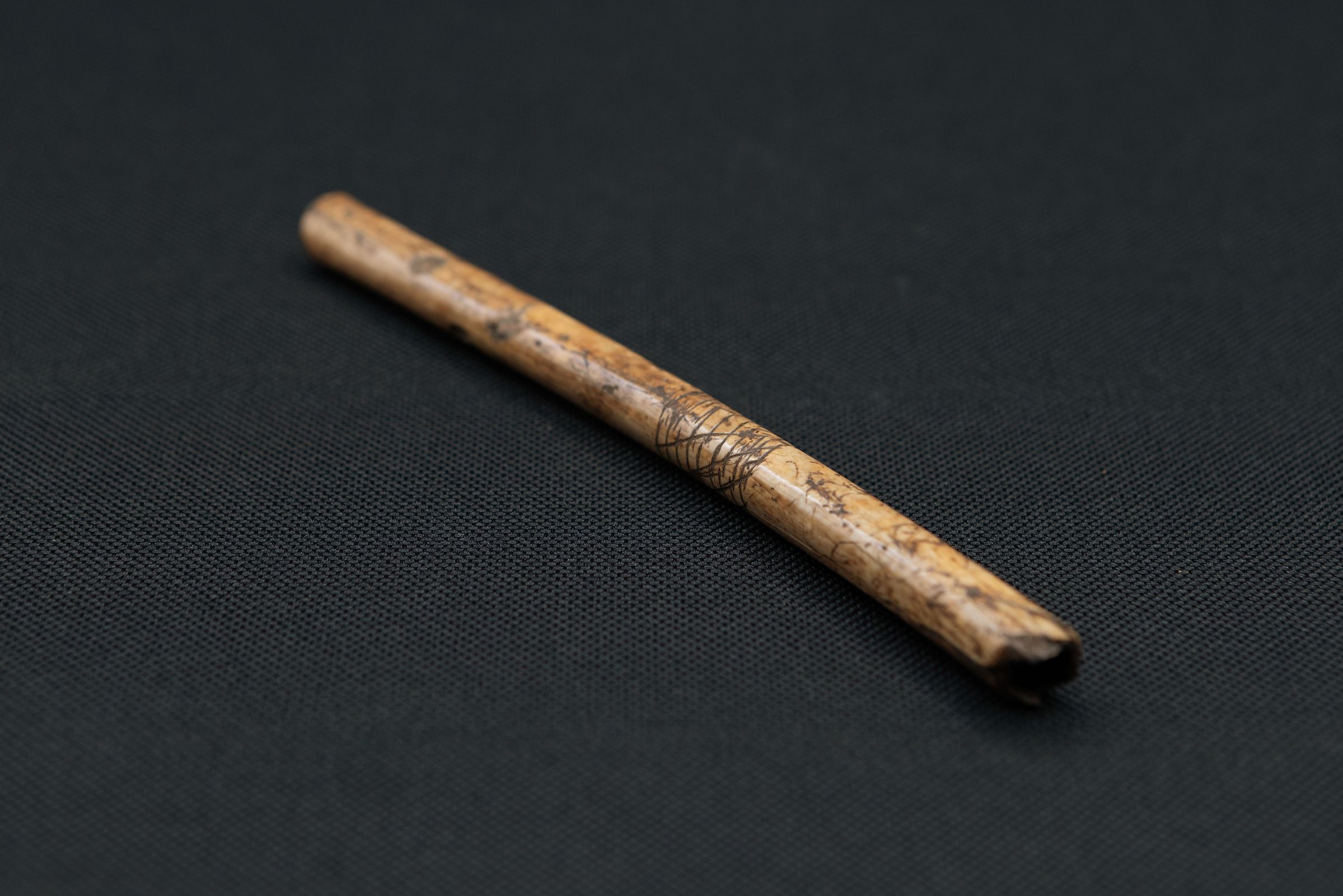 This ulna bone was taken from the wing of a wild turkey by Native Americans, and it bears etching which may have decorative or cultural significance.Collection
