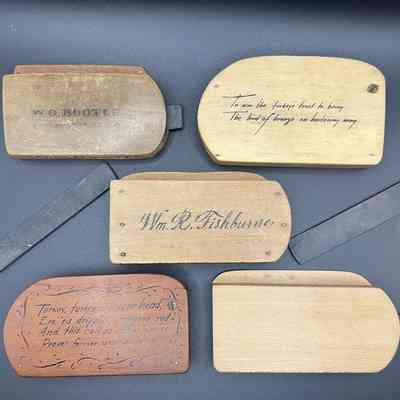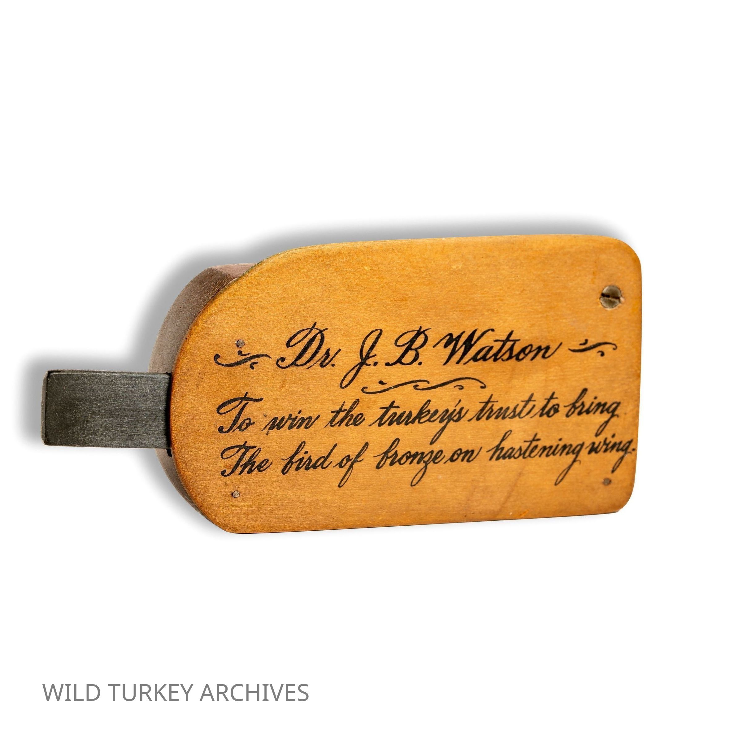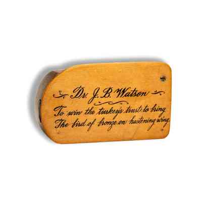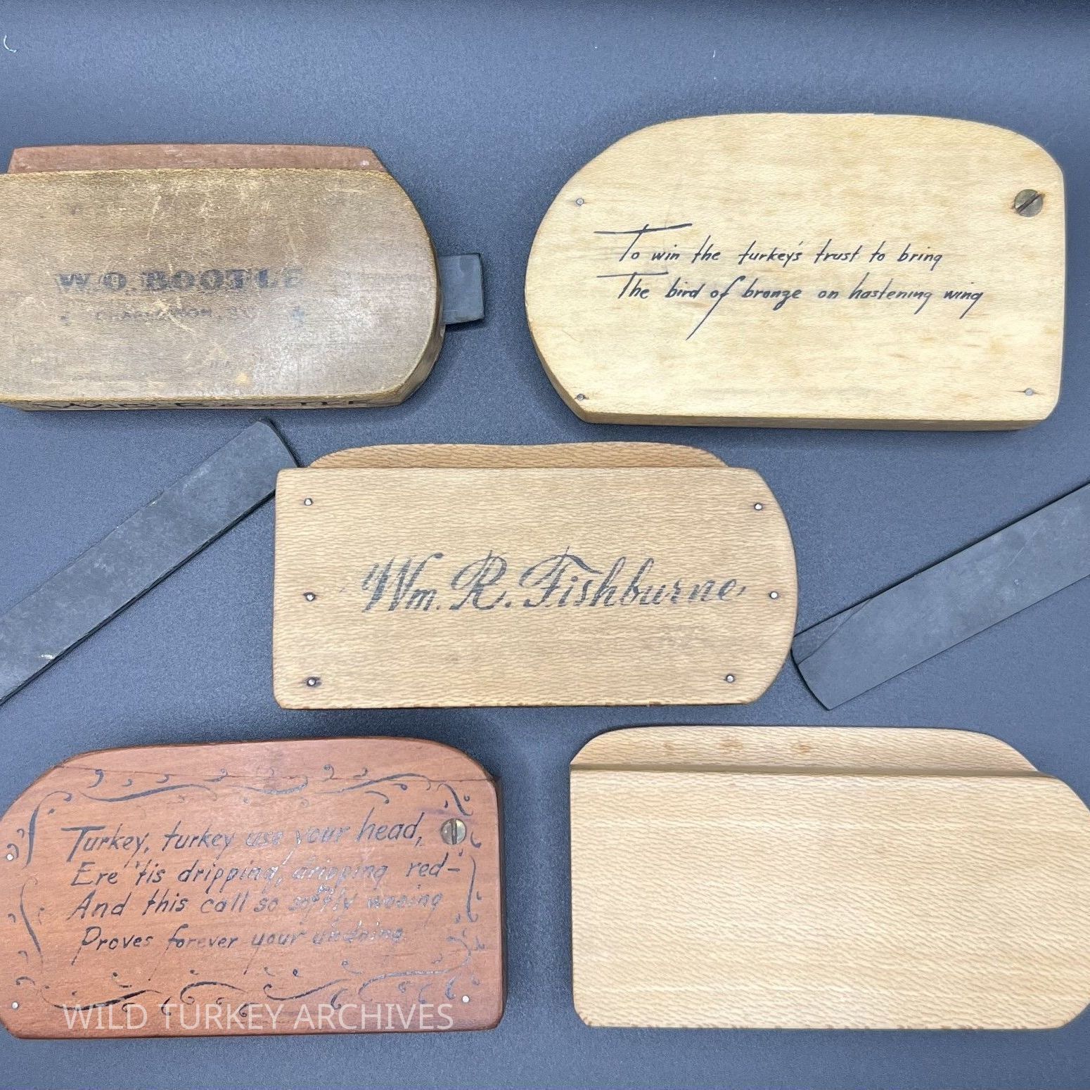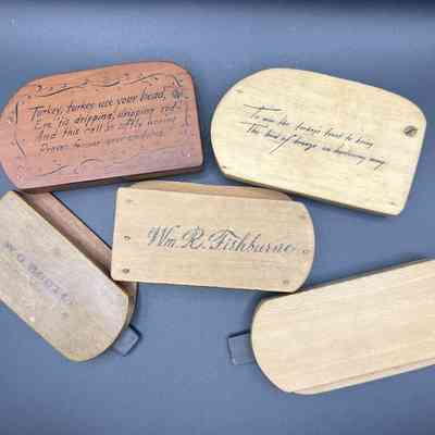 William R. Fishburne (1878-1953) of South Carolina made calls from 1905 until 1953, when he was struck by a car and died of his injuries. They are incredibly well constructed, with a slate striker that slides into a slot in the side of the call. Especially desirable are his "calligraphy calls,: adorned with the artistic writing of his friend Carl Metz.Collection