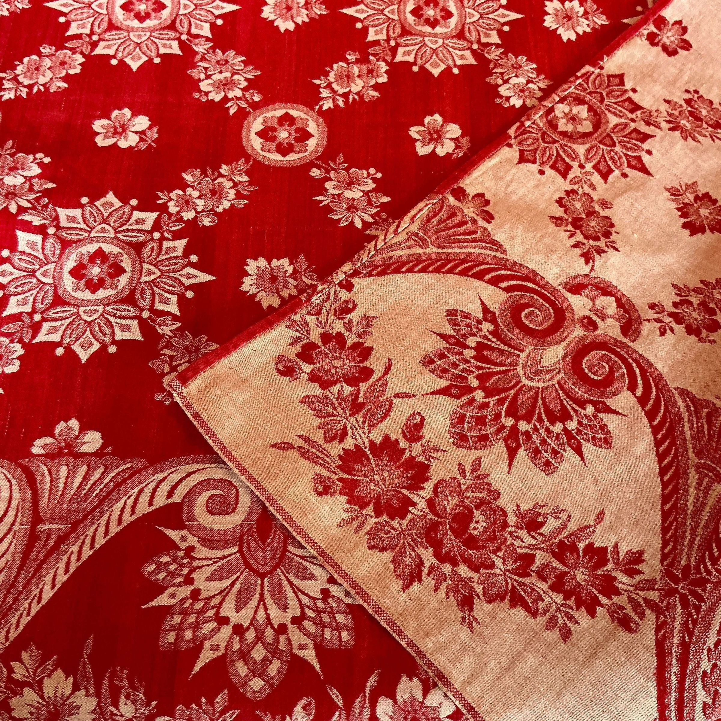 Turkey red table cloth with geometric floral design with hemmed edges.Six matching napkins with fringe edges.