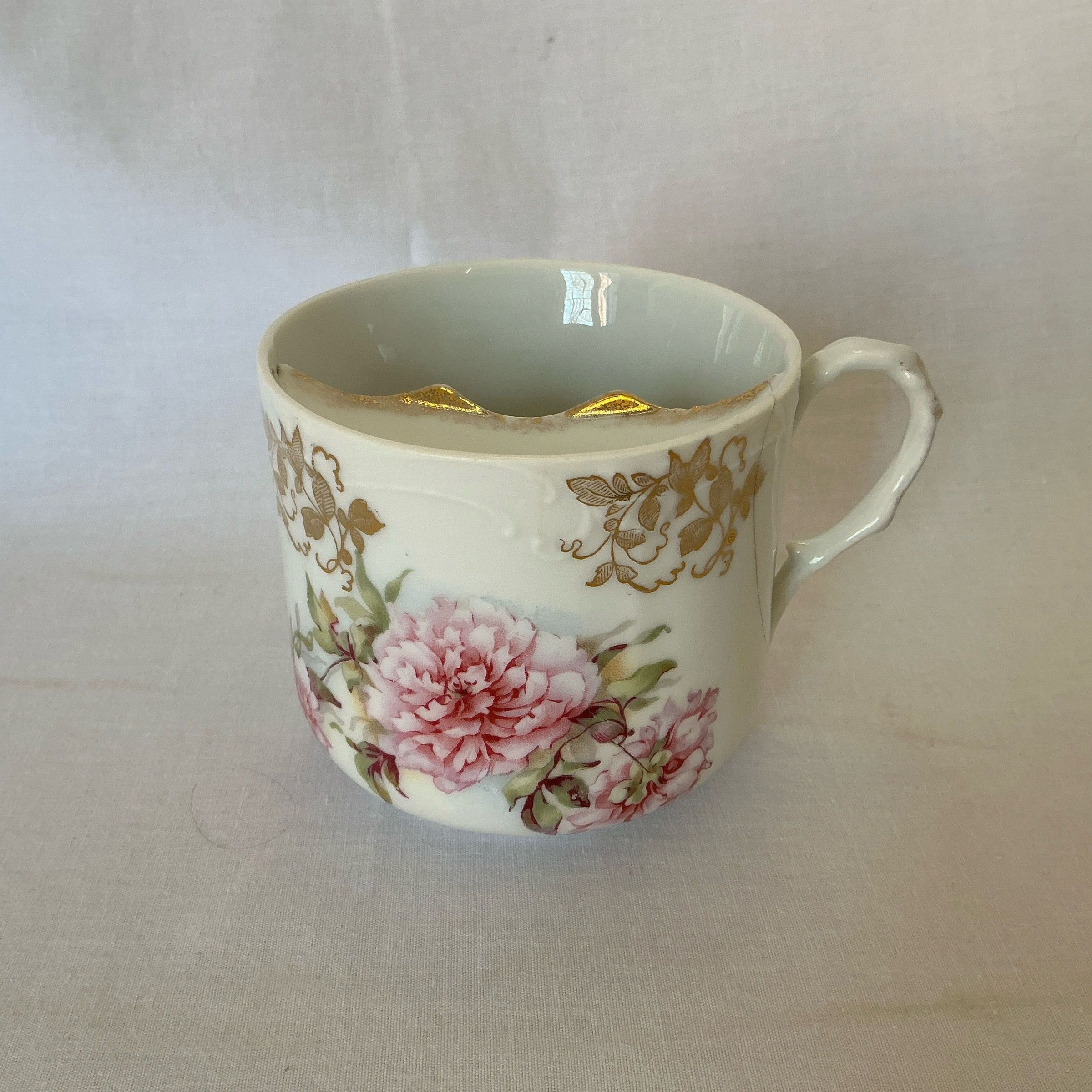 White china mustache cup with pink floral design on one side and leaf pattern on back side.Gold touches on handle and butterfly inside cup.