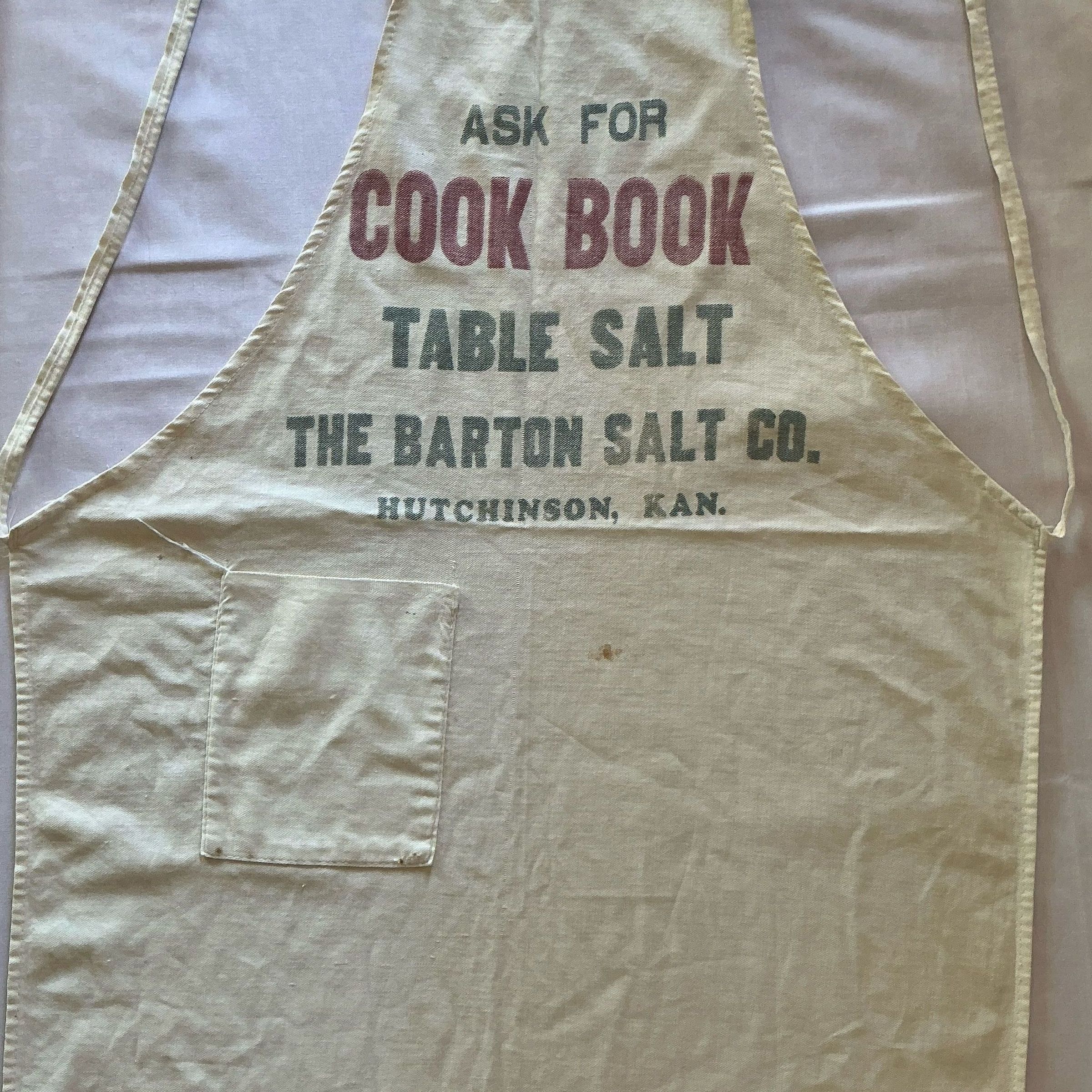 Apron made from a salt sack "ask for Cook Book table salt Barton Salt Co. Hutchinson, Ks. One pocket with tie neck & waist strings.