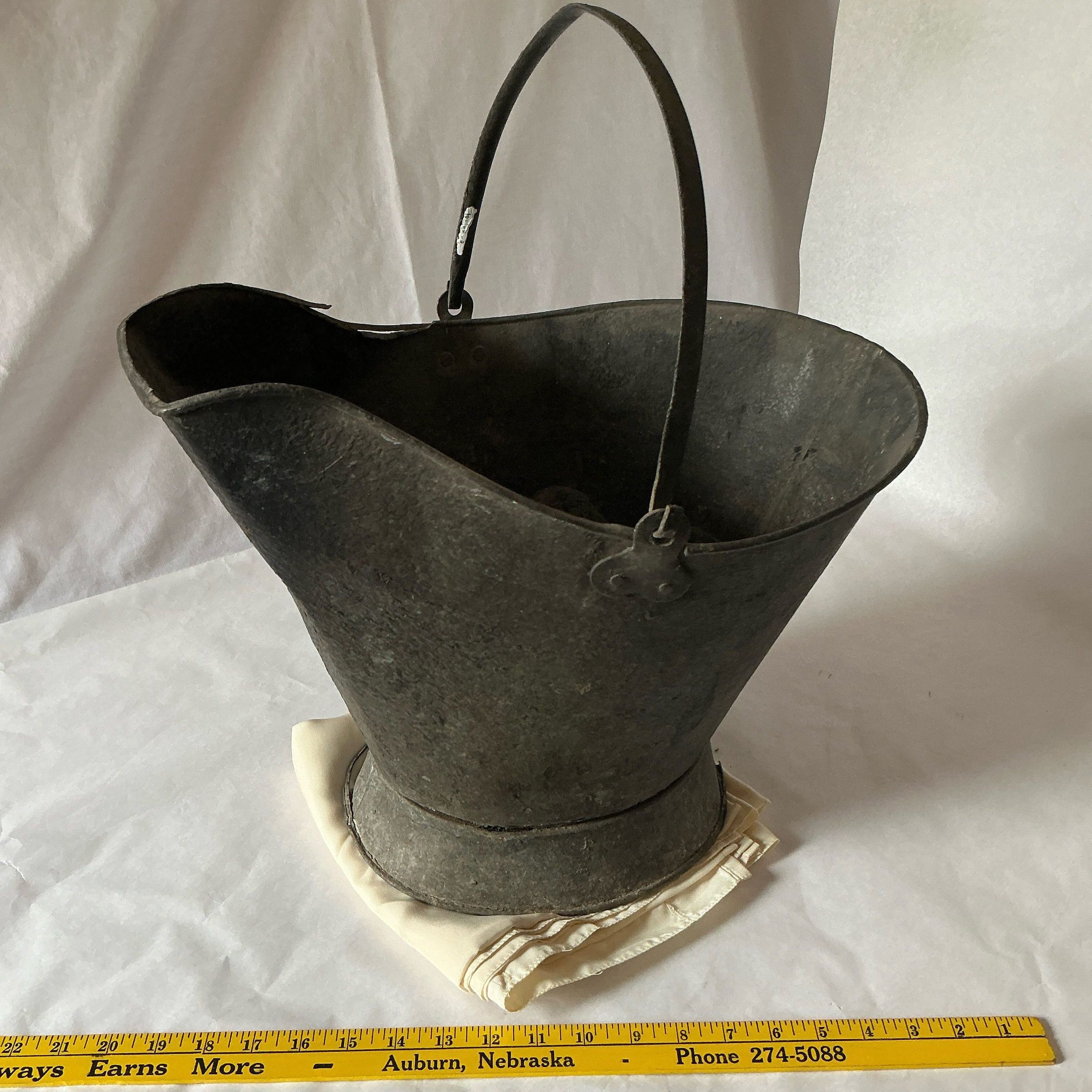 Metal bucket for coal also called Scuttle, Shuttle or Hod. A round back and square spout with a circular base. It has a lifting or tilting slot on the back and a metal handle.