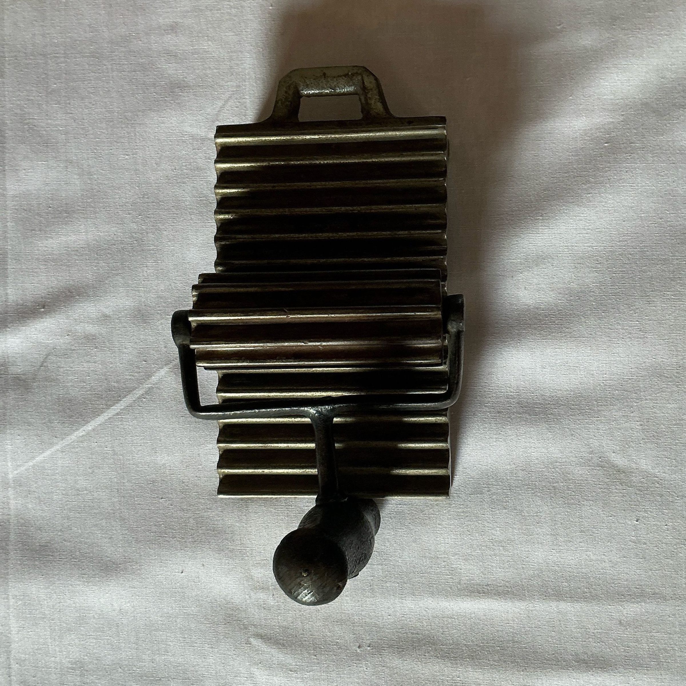 Fluting machine set consists of metal base, fluted base with T shaped wooden handle on metal roller and 2 heating 'slugs' and lifter