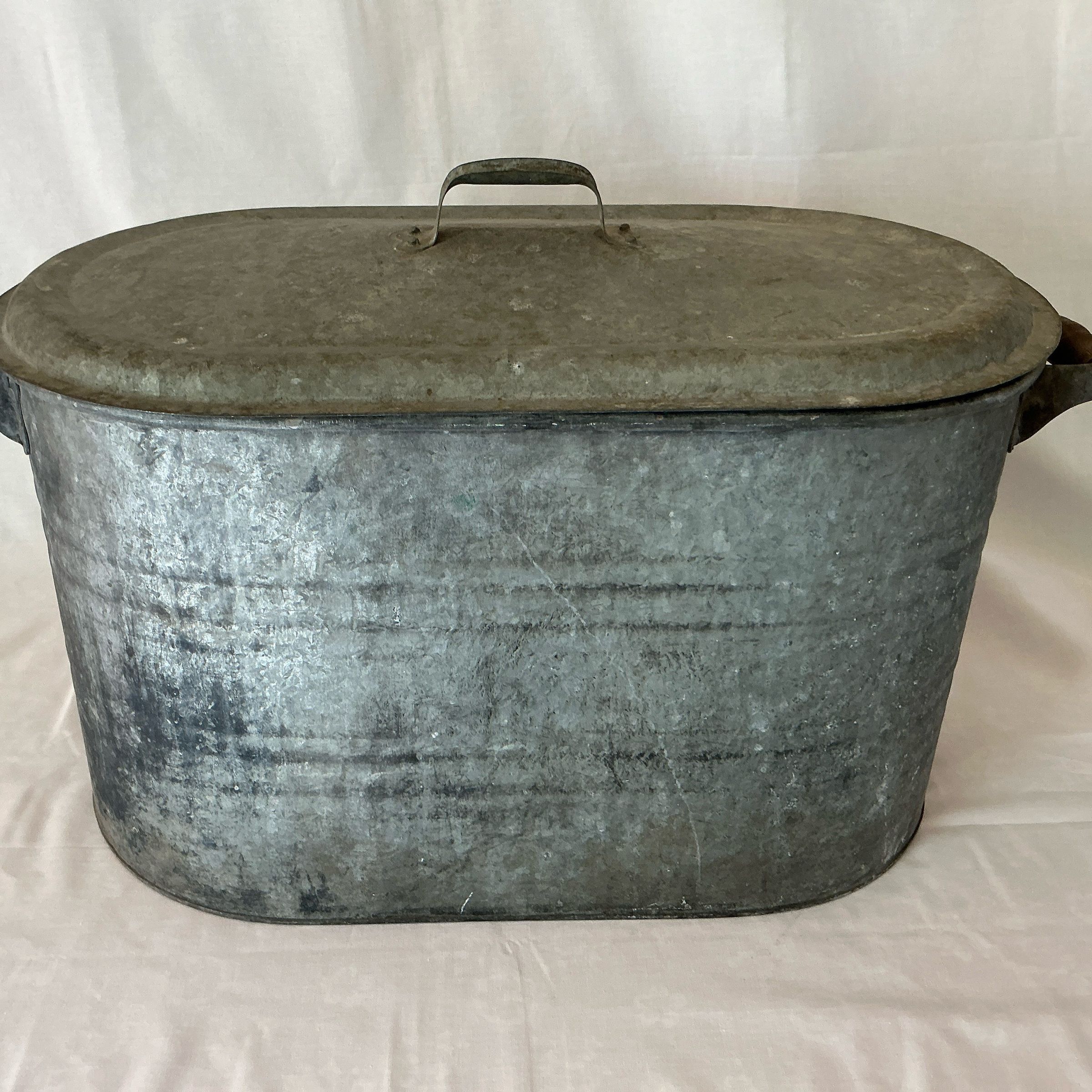 Metal [not copper] wash boiler, oval in shape.One wooden handle, missing on the other side with only bracket and pin attached. Hard water stains inside. Lid has center metal handle.