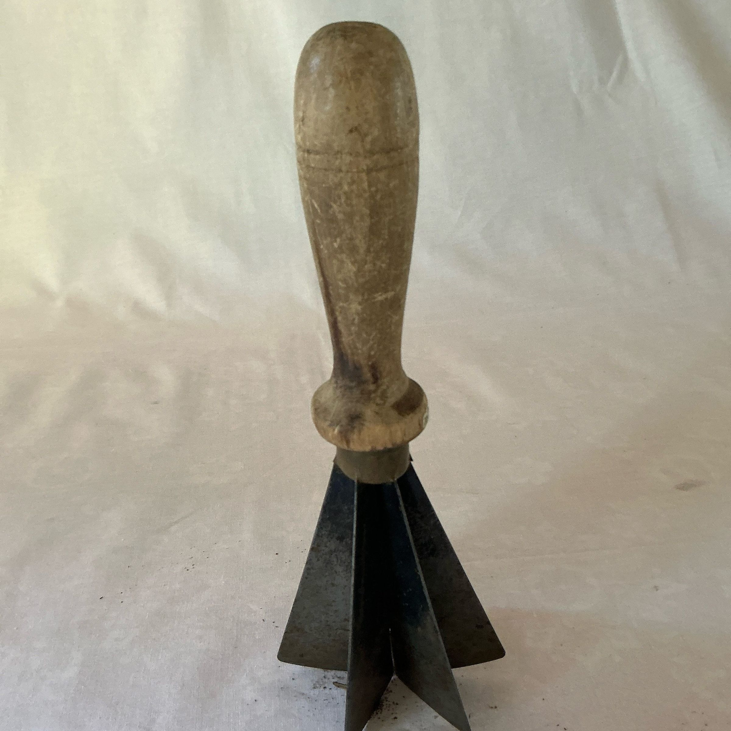 Wooden handled food chopper with six metal blades.