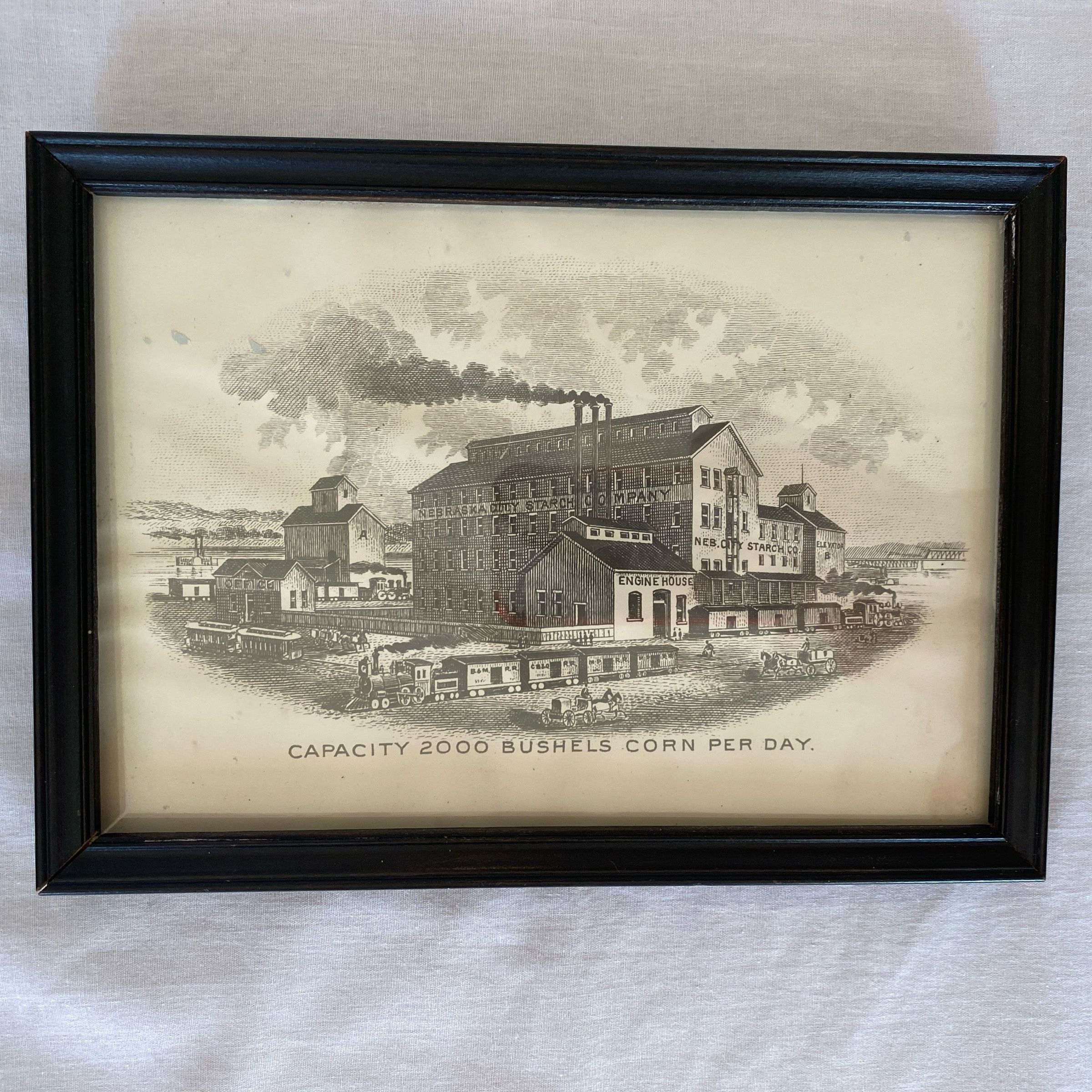 Framed print of Nebraska City Starch Works. Large industrial buildings with the tallest having three smoke stacks. Train in front. Printing says Capacity 2000 Bushels Corn Per DayContext