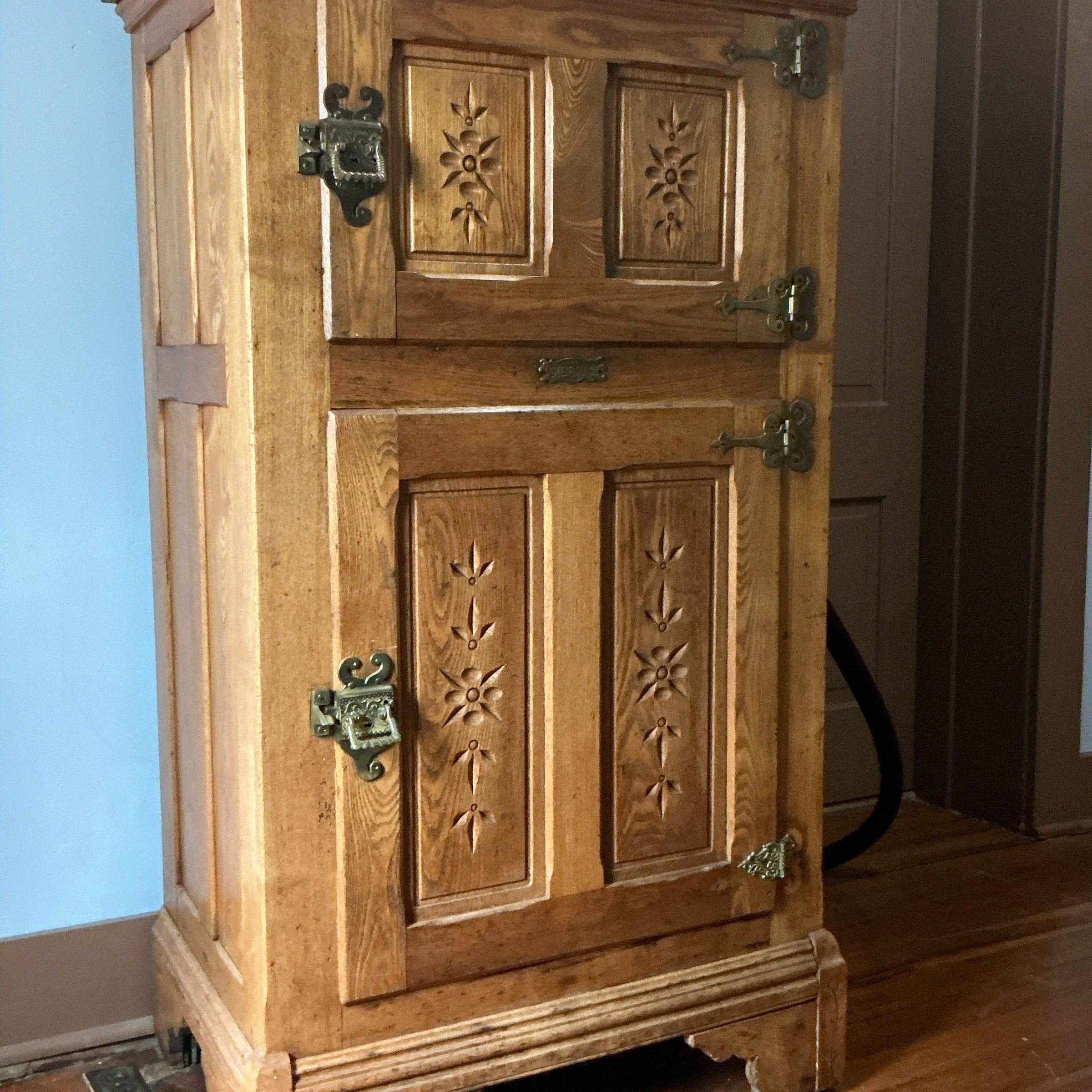Oak ice box with incising on each door. Larger door at bottom. Metal rectangular shaped tag on front says The Siberia. Zinc lined. No shelves. 3 matching hinges & bottom hinge different. Latch on each door which lift up out of holder & open left to right.Context