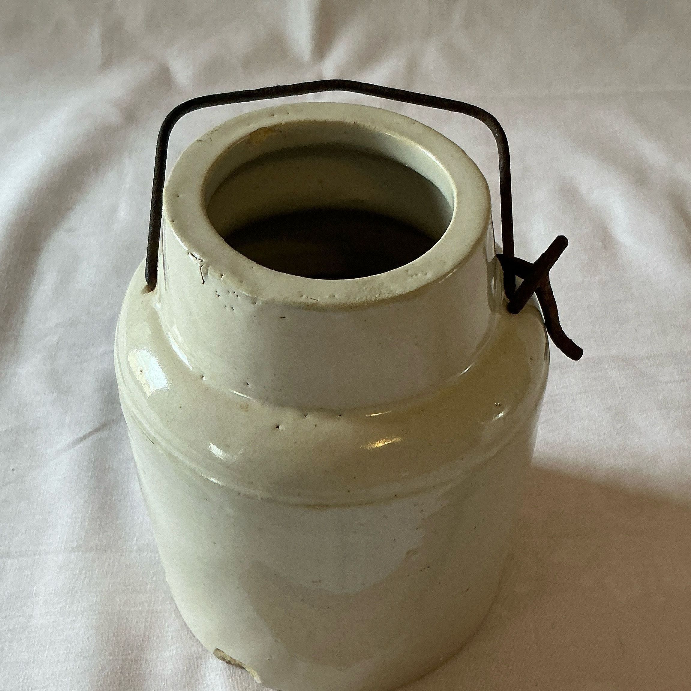 An Iron stone cream colored jar with a broken wire latch on bale.