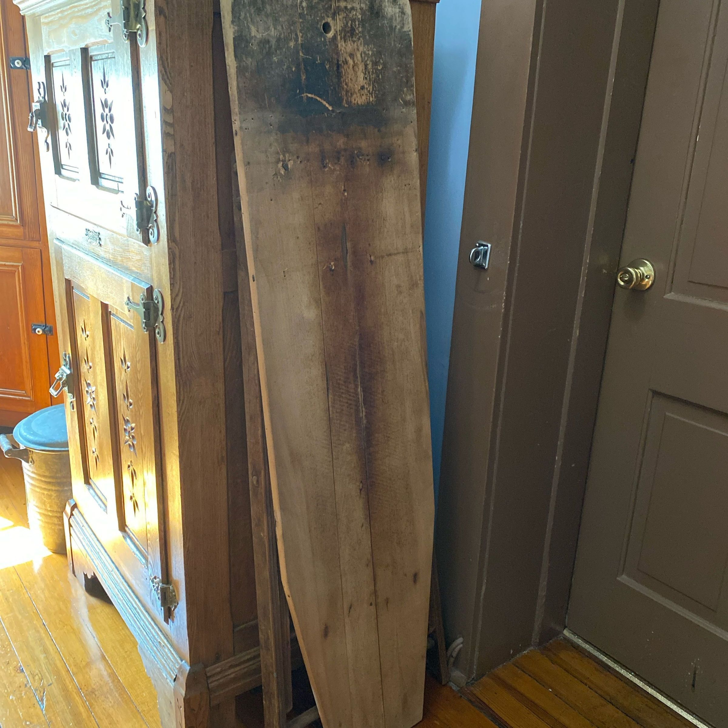 Wooden ironing board, legs fold on wooden dowels. A wooden catch to adjust legs. Hole in board on wide end. Illegible writing on back.Context