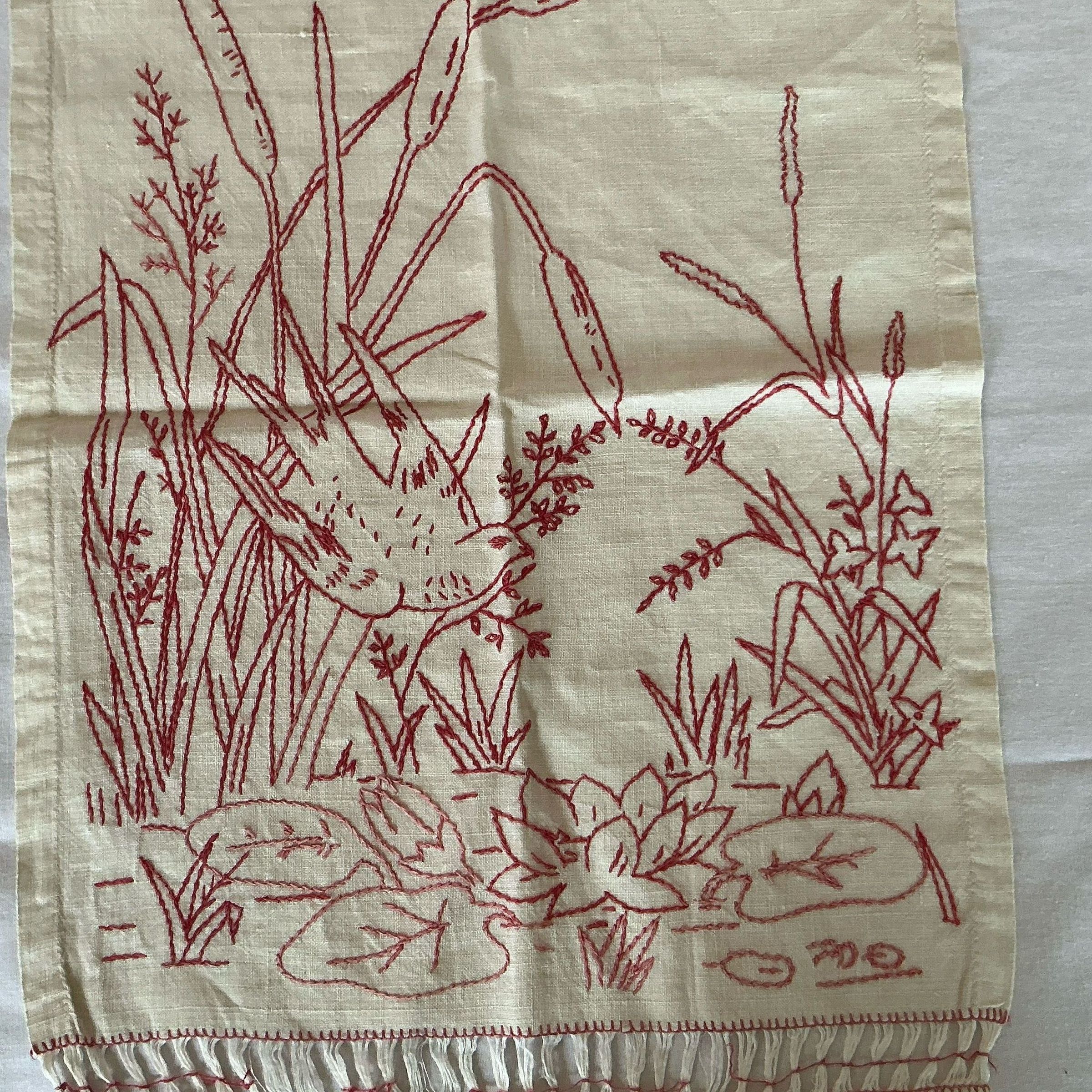 Hand towel or back splash or small scarf embroidered in turkey red. Picture is a marsh scene with bird, Lillie’s and cattails. Below picture is drawnwork and then a crocheted border.