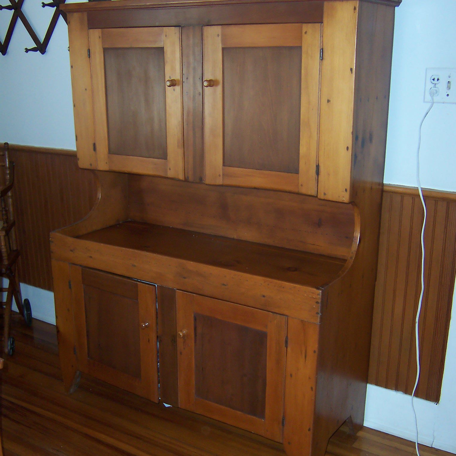 Storage cupboard made of pine with cherrywood panels. Item is pegged together. Wooden latches on each door that turn to fasten. Two doors above a surface with a solid rail around edges. Plate groove near back. Two doors below. Base is wider than top portion.