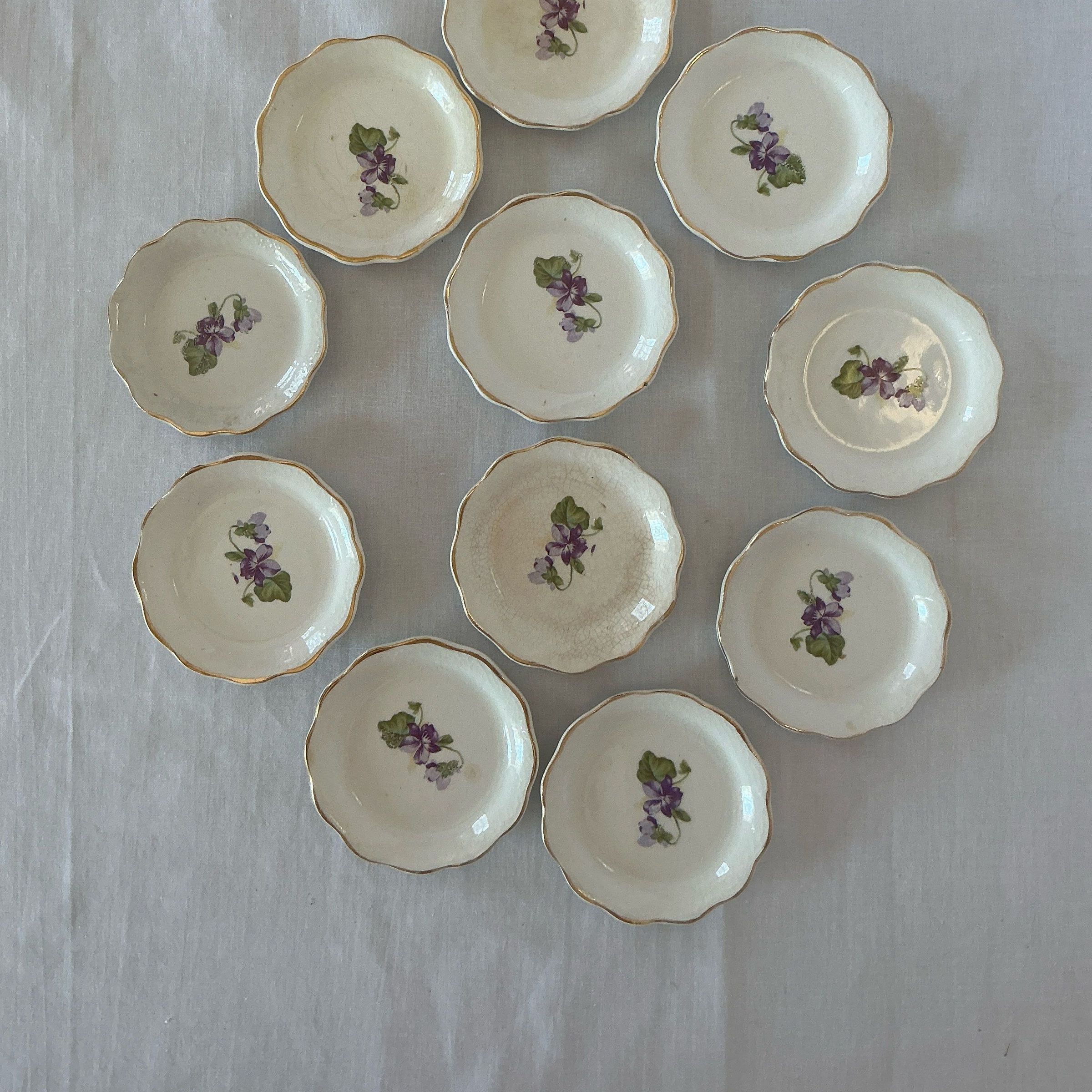Set of china transferware butter pats with violet design in center with wavy edge and gold trim.