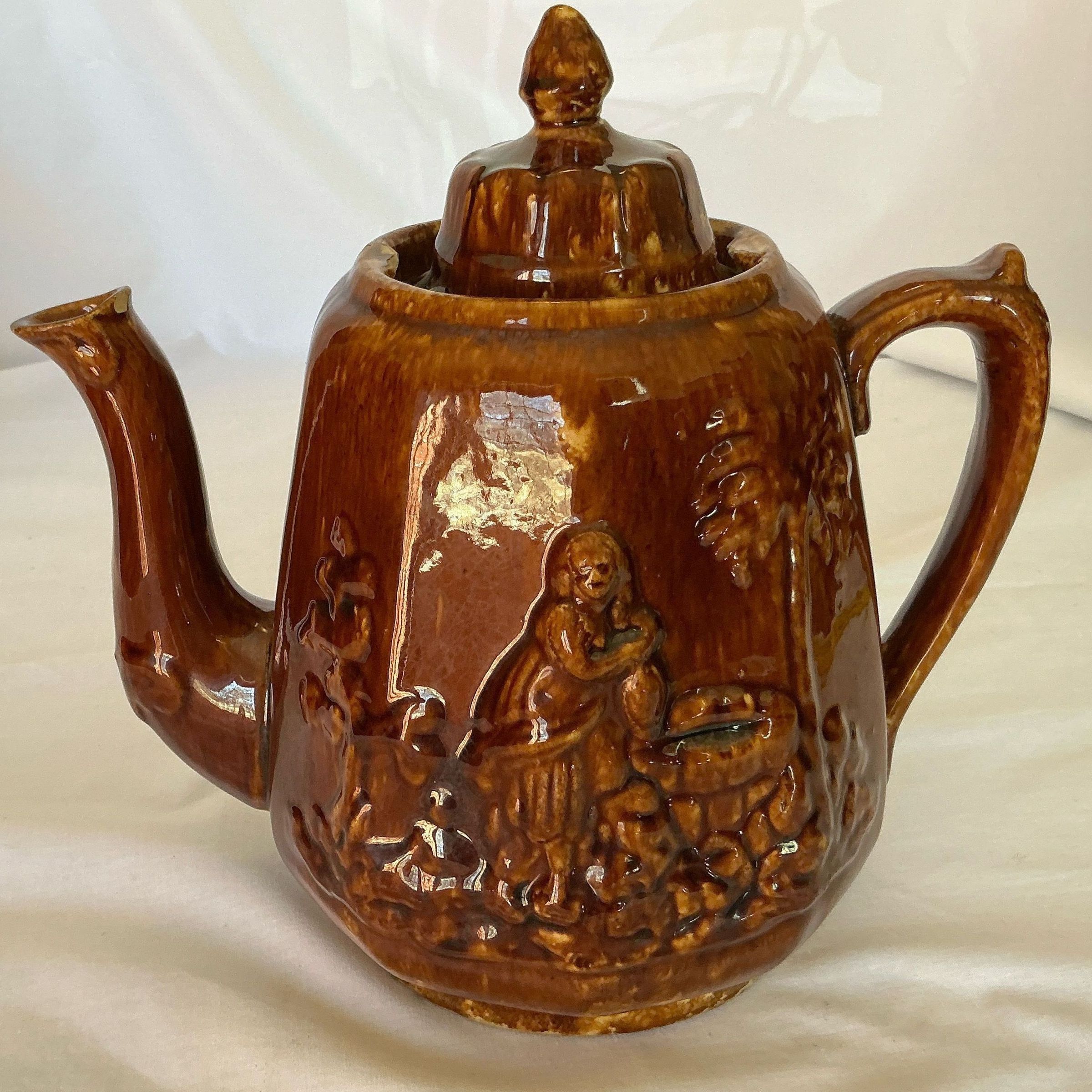 Brown pottery teapot with raised figure of Rebecca At The Well. Conical lid with knob on top.