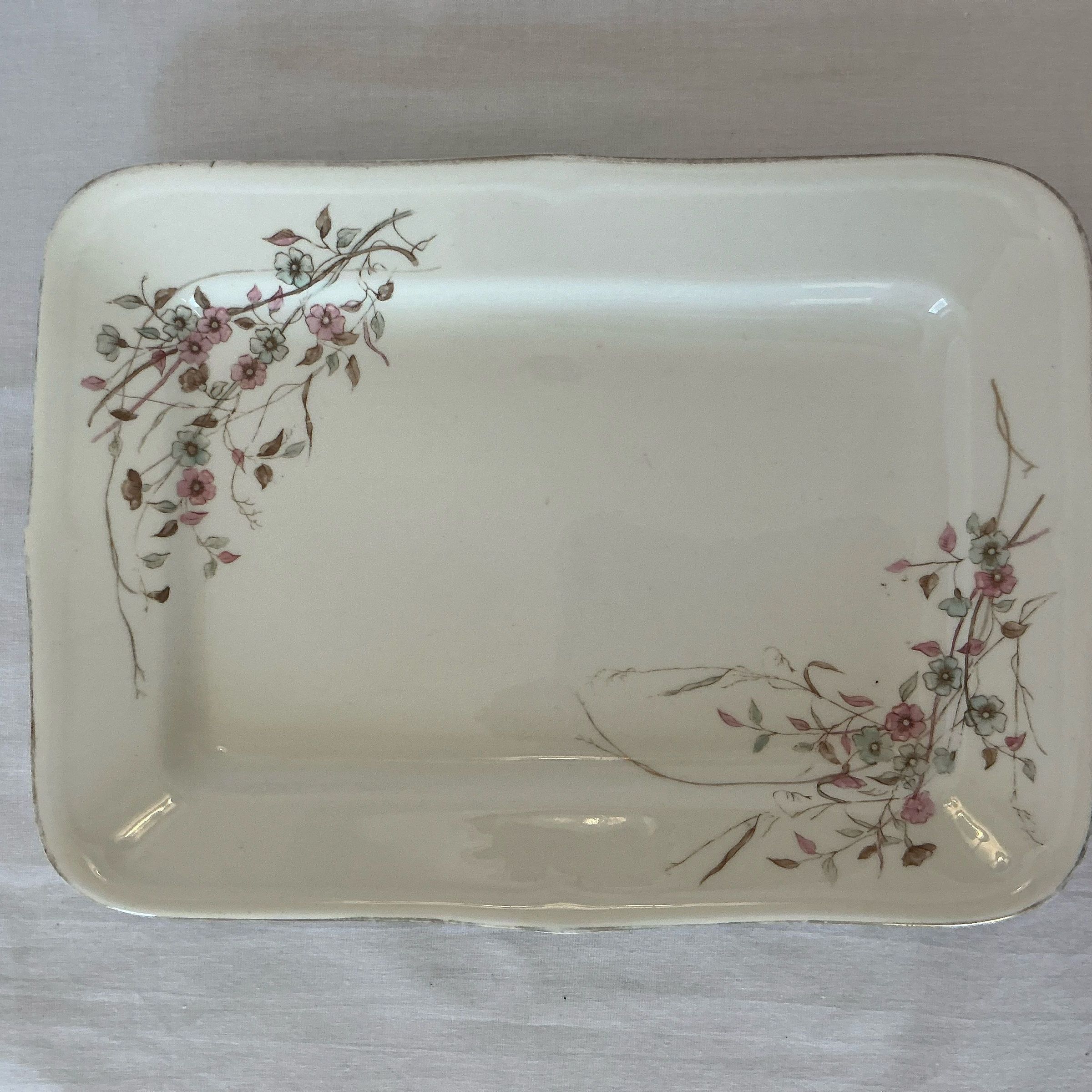 Rectangular serving platter with pink floral design in opposing corners.Gold trim around the top edge.