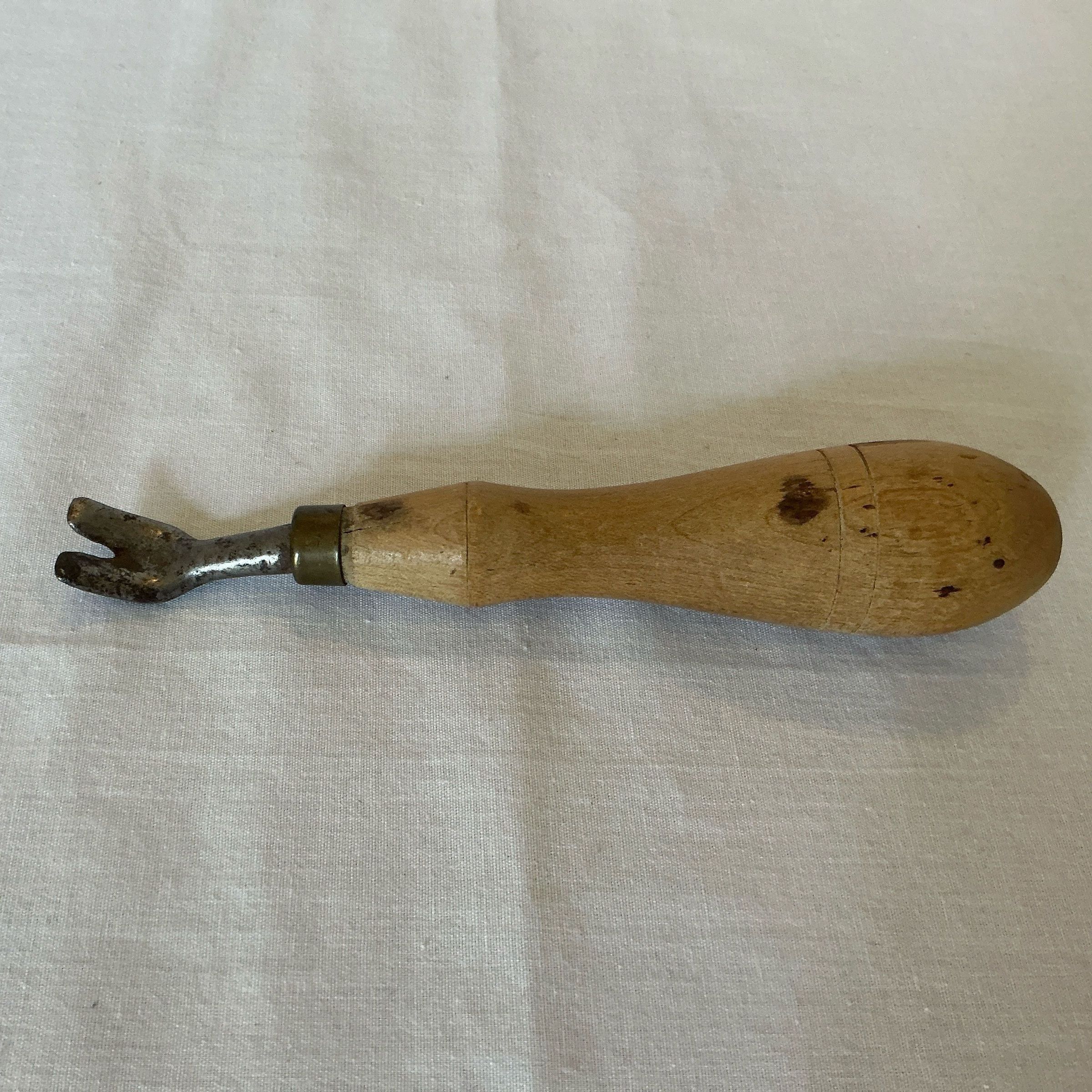 Wooden handled tack puller. V shaped puller on short metal handle connected to ferrel of wooden handle.