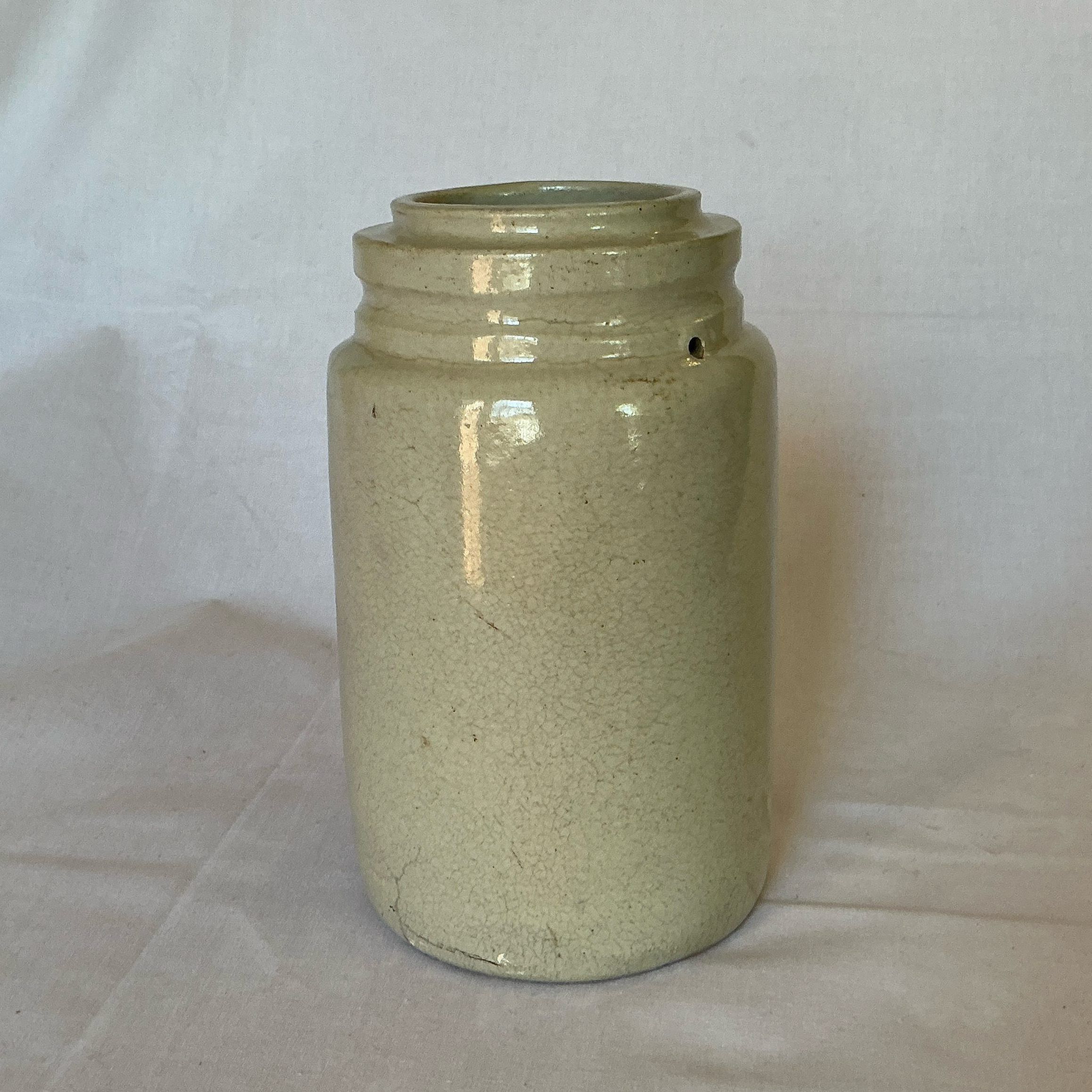 Wide mouth stoneware fruit jar. Small holes on either side near the top to hold a bale3 to hold the lid down to seal the jarCollection