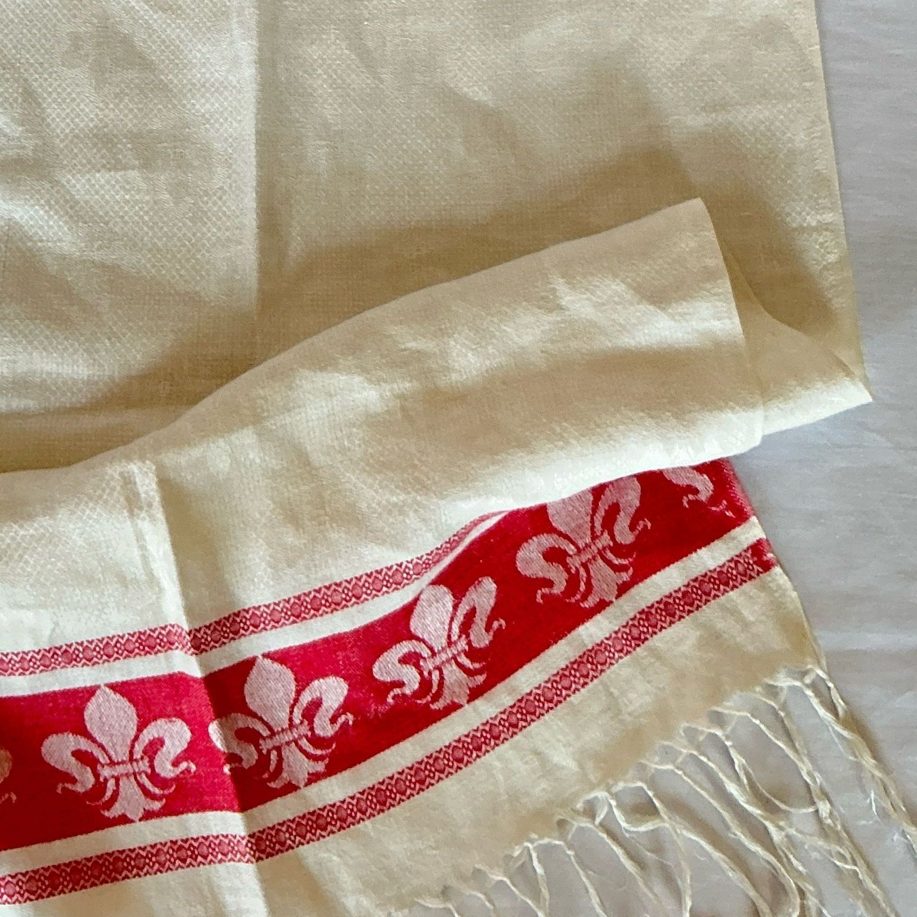 Towel with red and white woven design and fringe on both ends. Fleur-de-lis design in red and white at each end and woven through the towel