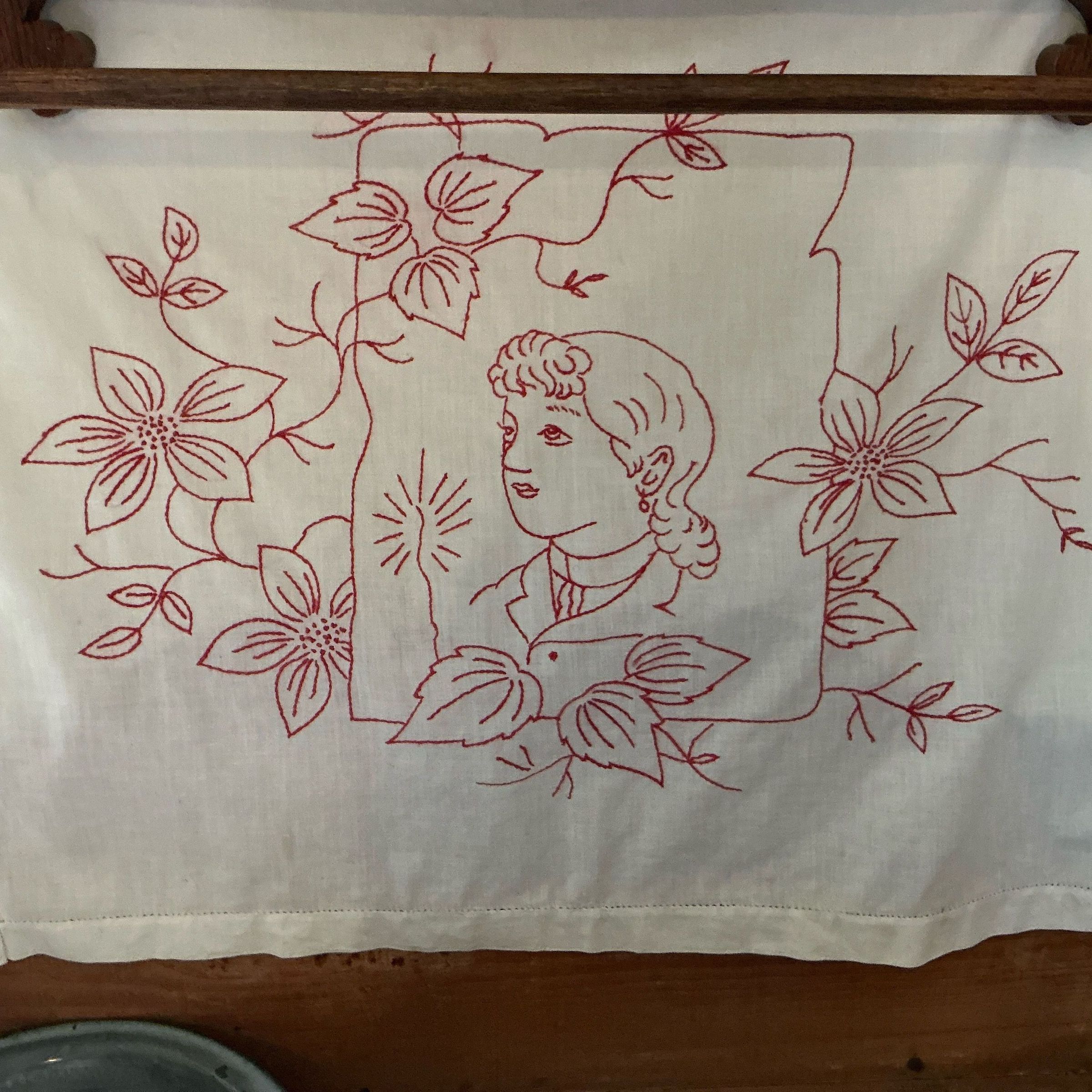 White fabric with Turkey Red embroidered picture of woman in center surrounded by flowers. Hem stitched edges.