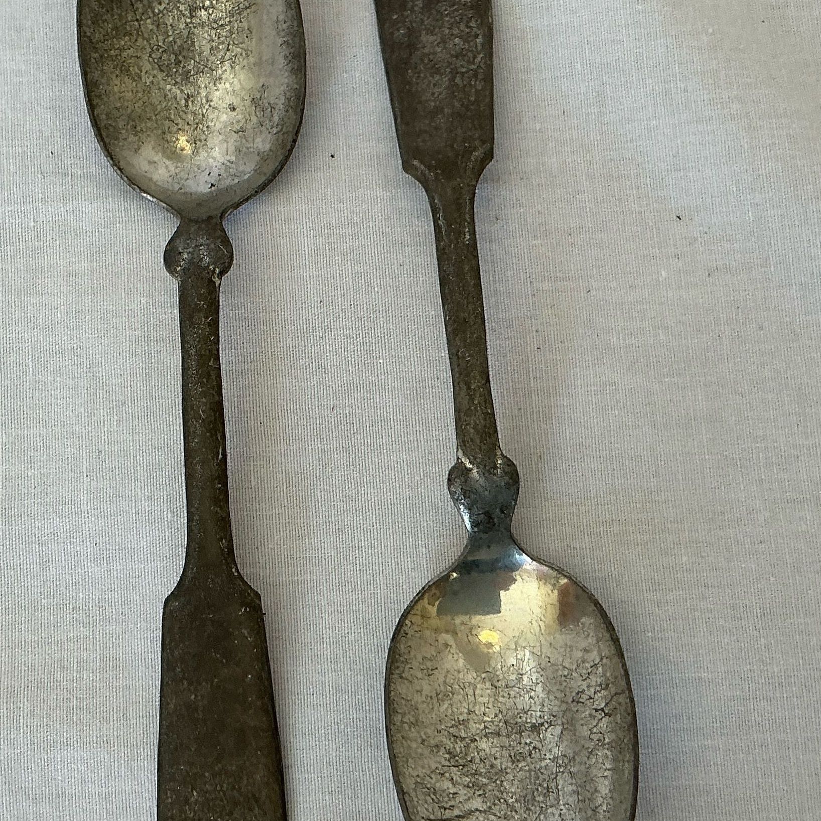 Two metal teaspoons with raised mark on back. Very plain pattern, end of handle similar to top of a heart.