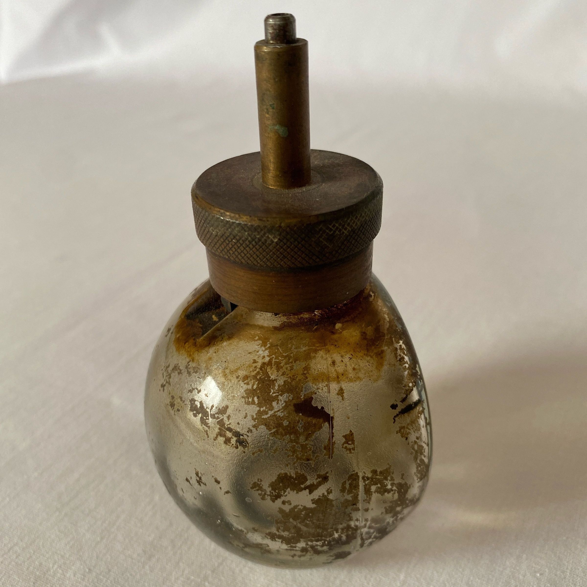 Small, heavy glass jar with mark on bottom and flat on one side. Metal filler cap marked Made For Vacuum Oil Company. Bottom mark is diamond shape in the glass. Opening is a tube which descends to bottom of bottle interior.Context