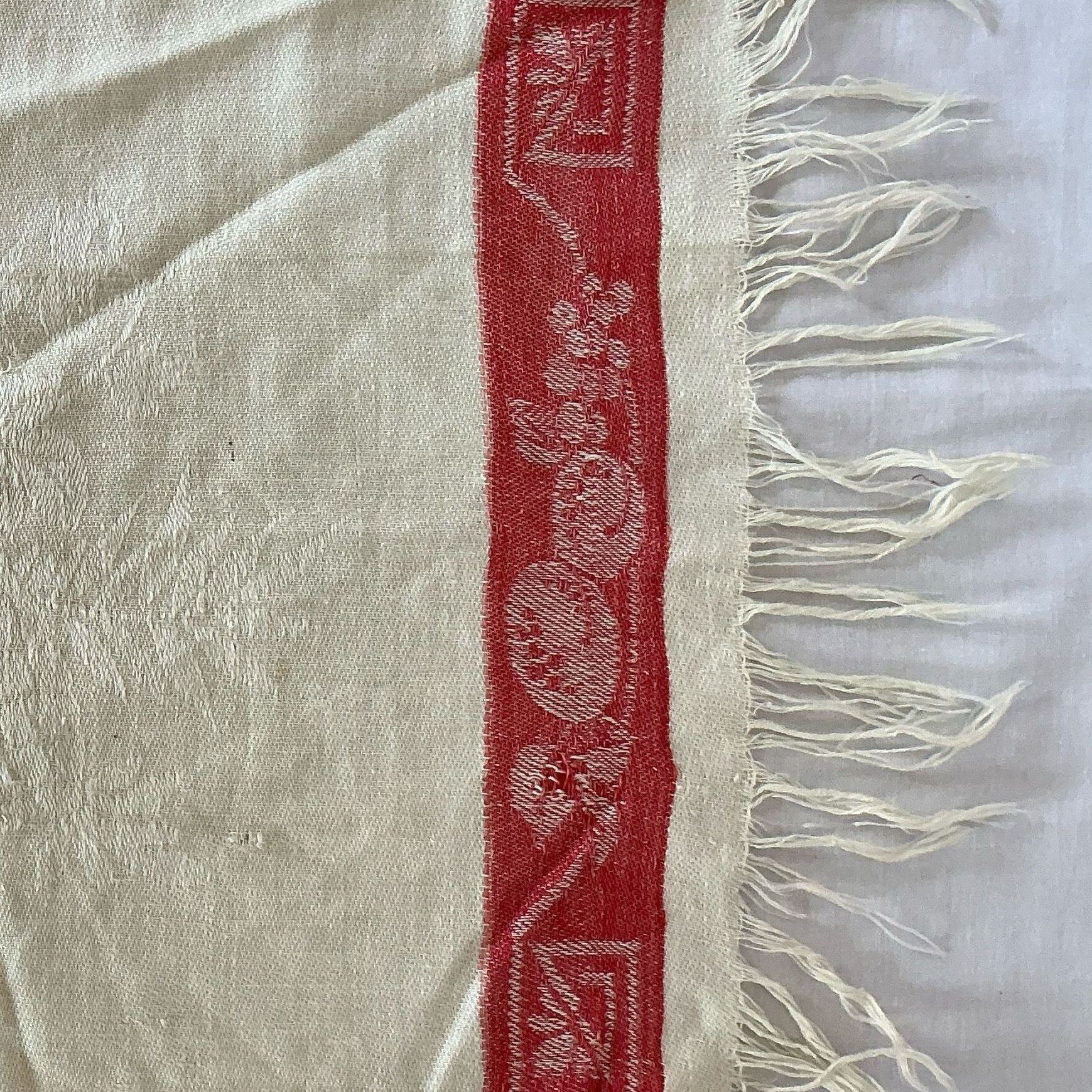 White damask towel with floral design in center. Red borders on both fringed ends with fruit & grape design.Context