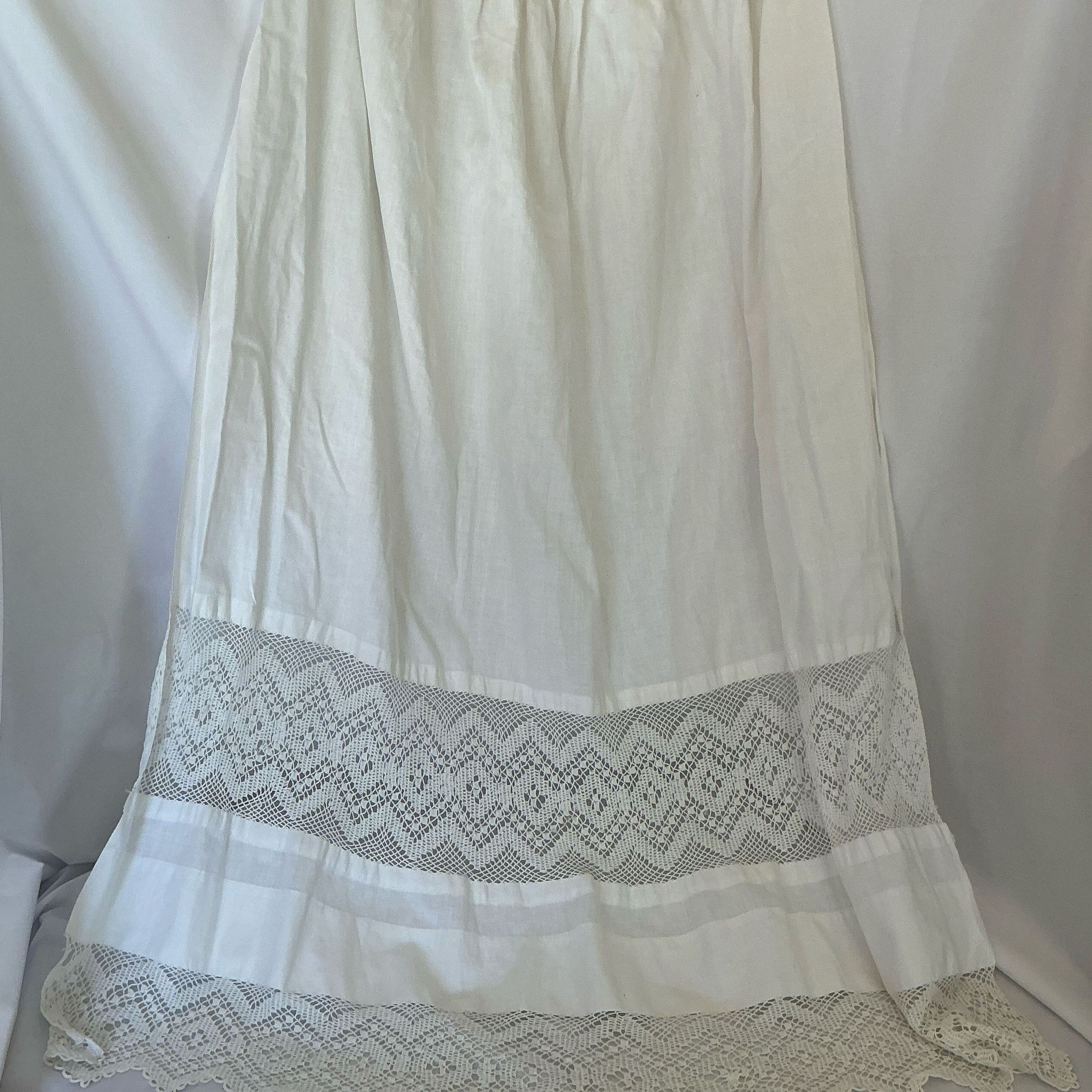 White floor length apron with lace insert 6" vertical above the 4" cloth hem where bottom lace is attached. Pointed lace makes the hem of 4" that matches pattern in inserted lace.