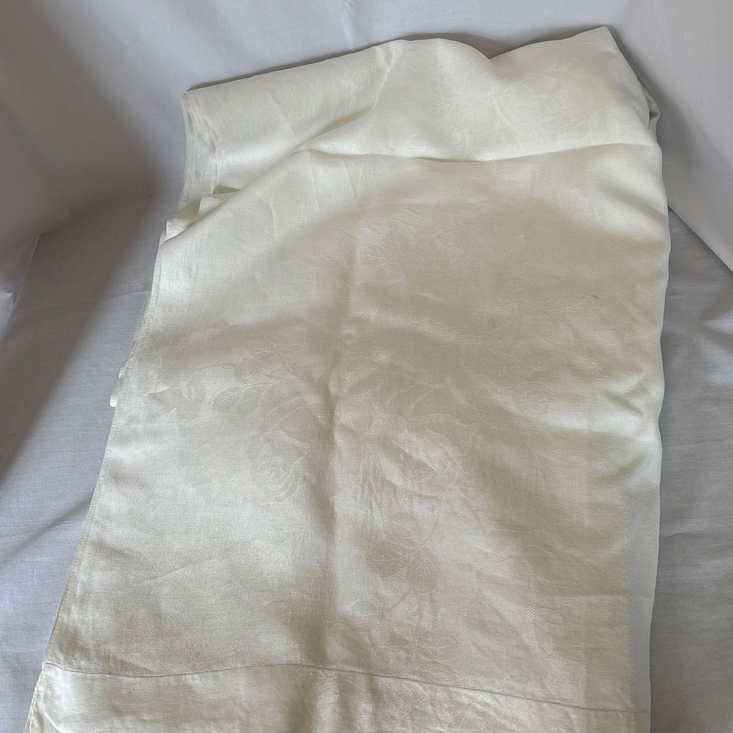 White linen or damask tablecloth. Floral design woven into fabric