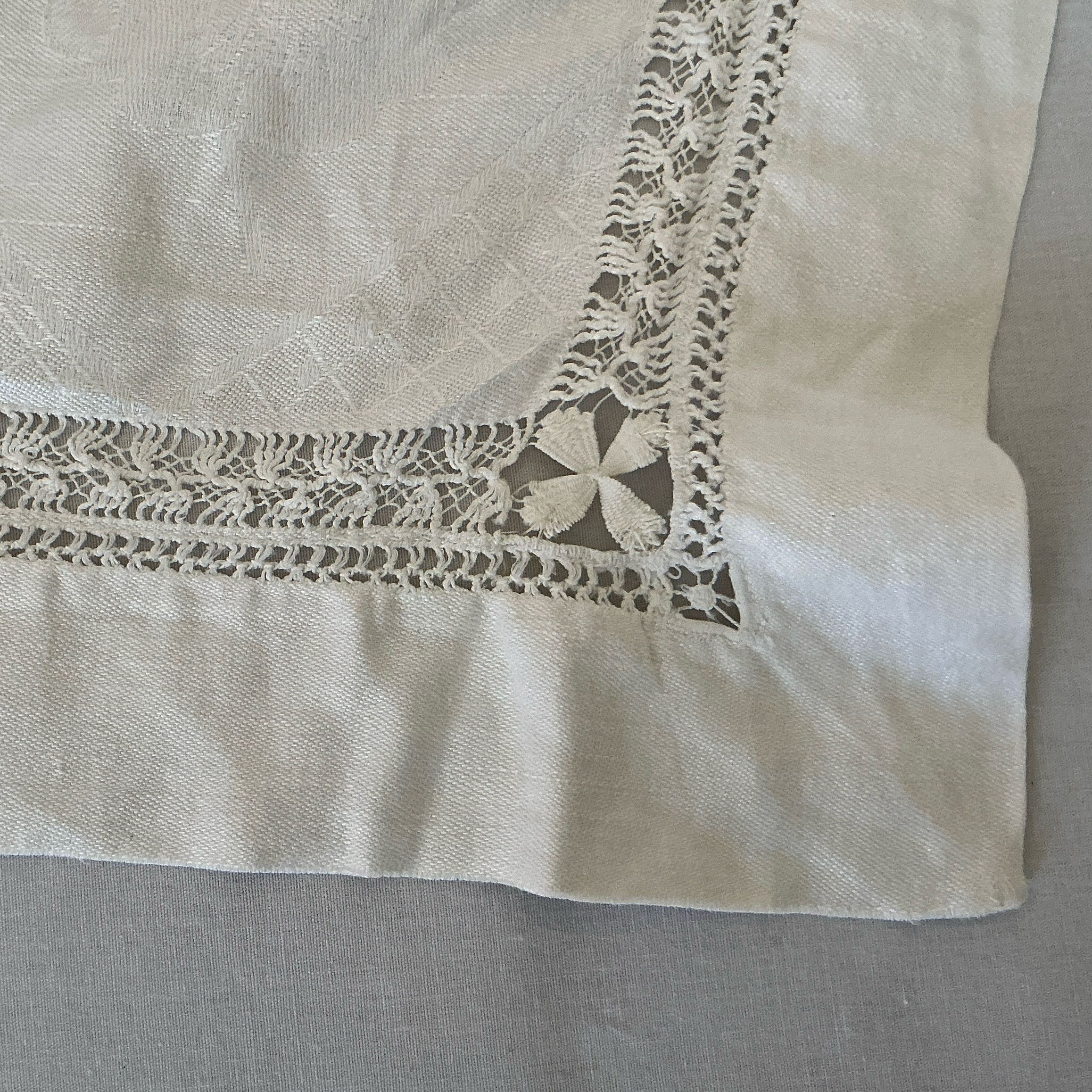 Damask white tea cloth in pansy pattern. Open insertion work along all four sides. Flower design in each corner of openwork pattern