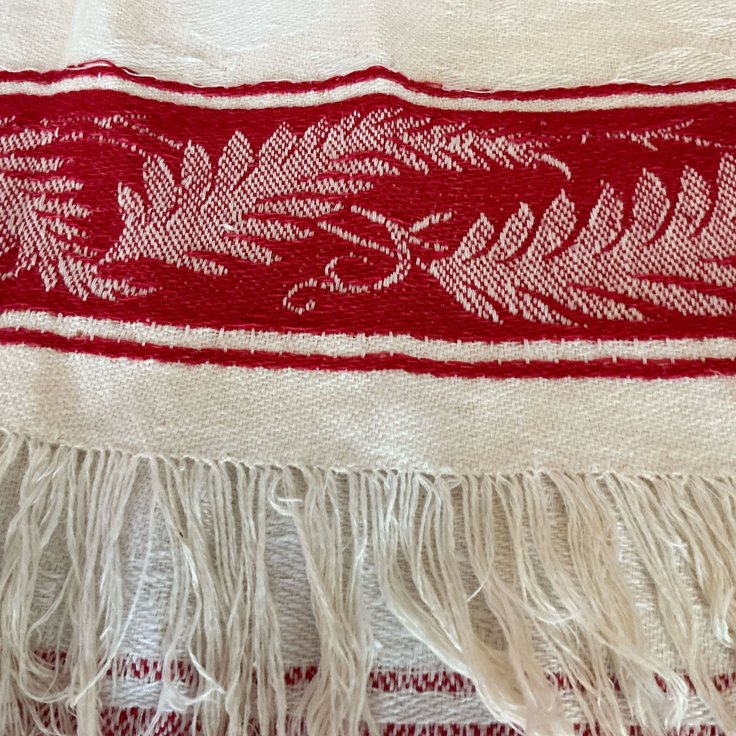 White damask towel with wide band red leaf trim and fringe at both ends. Red trim all around edges .