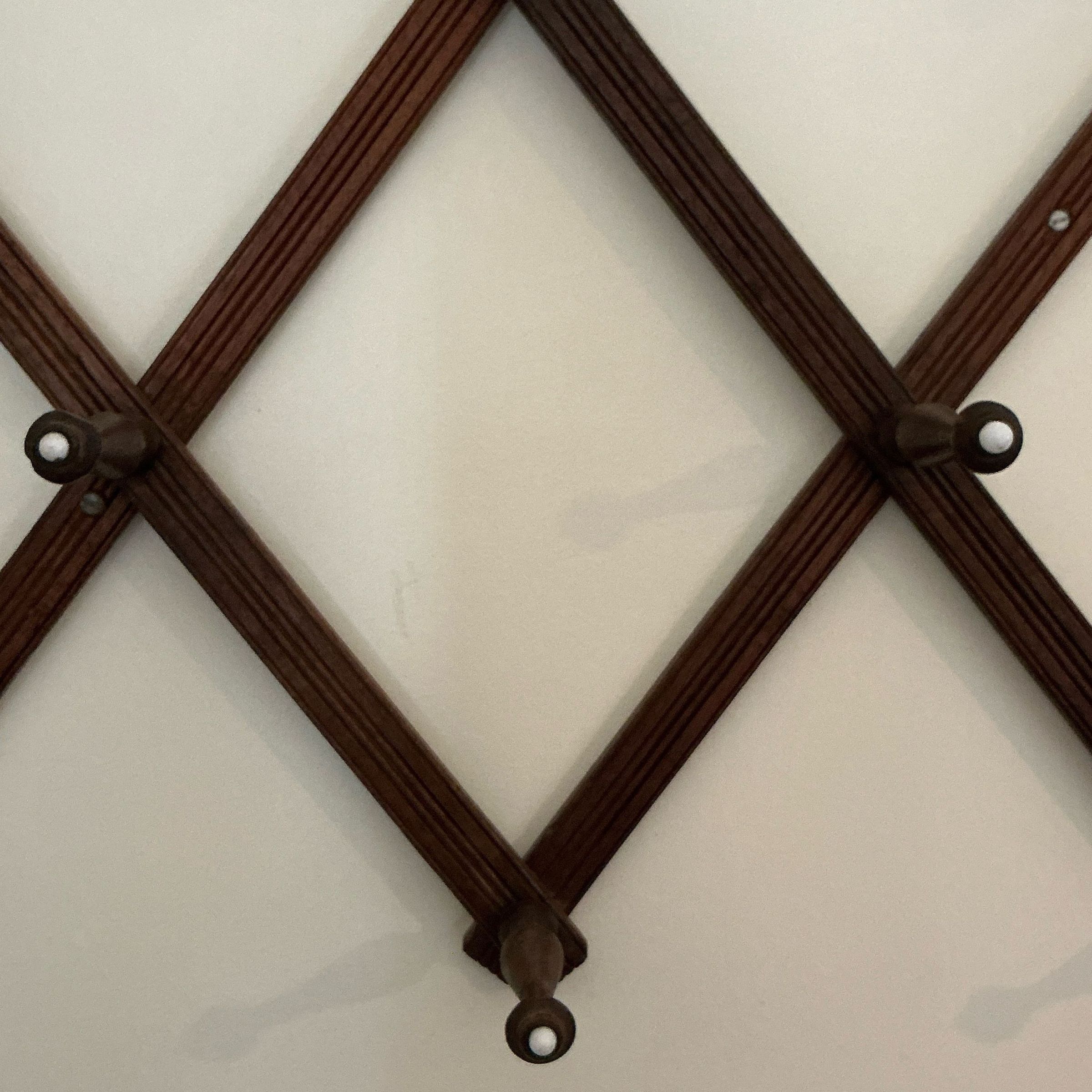 Wooden accordion style hat rack with 10 pegs with porcelain buttons on the ends. Vertical perpendicular grooves make design in wood.Context