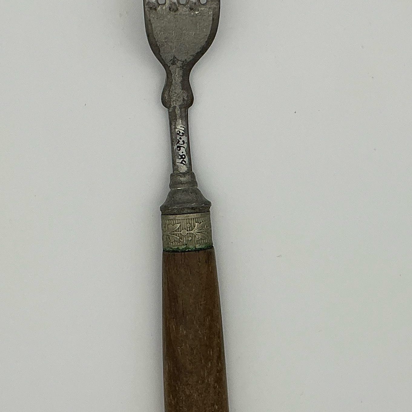 Wooden handled fork with four tines. Silver feral with leaf design.